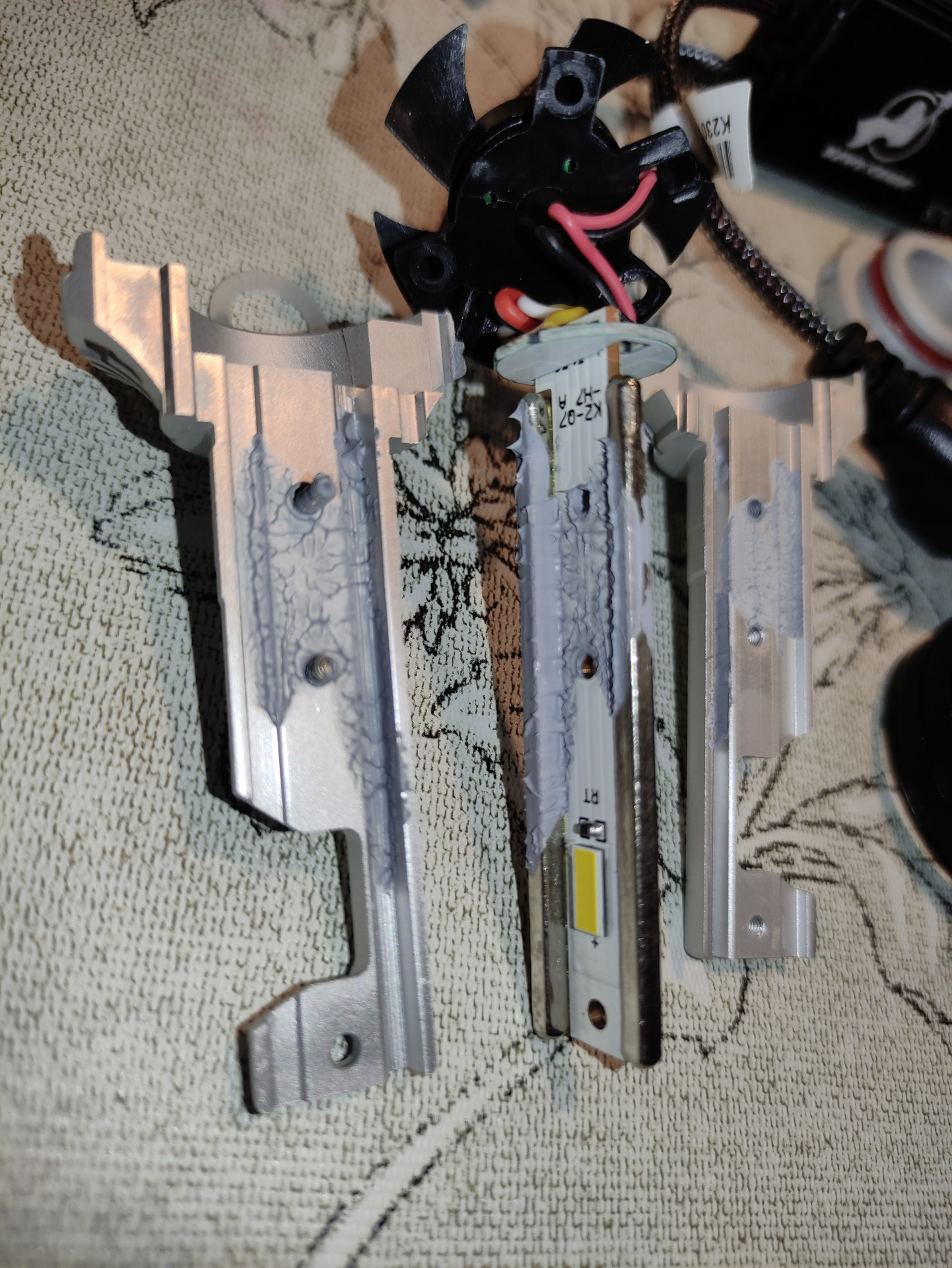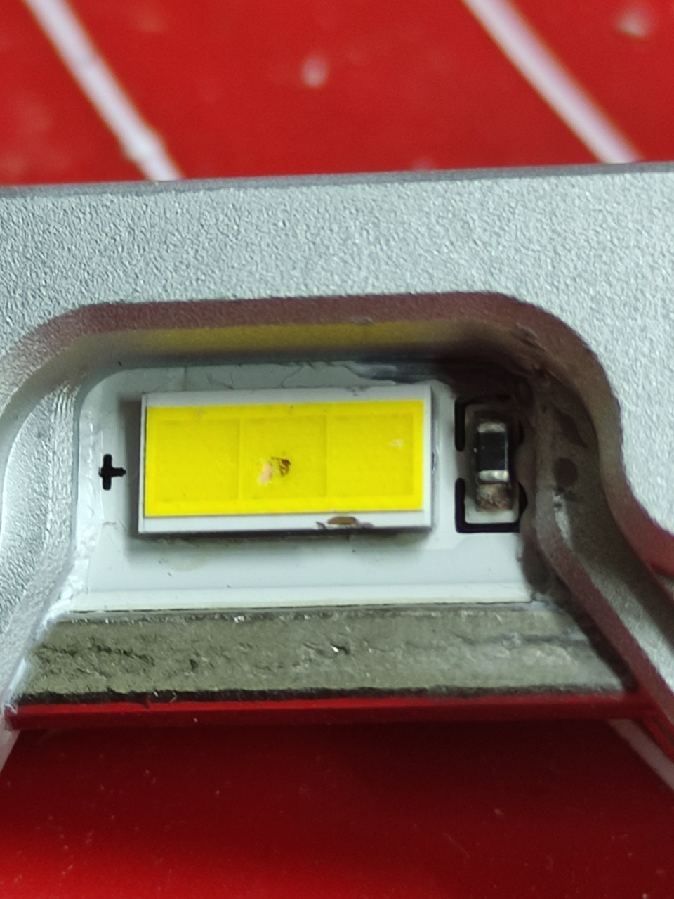 Кристалл вблизи. Люминофор не очень то крепко держится. Рядышком виден терморезистор для контроля температуры кристалла. В теории это должно продлить жизнь лампе и не должна будет быстро деградировать