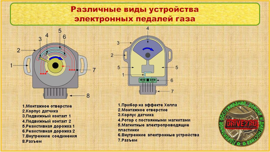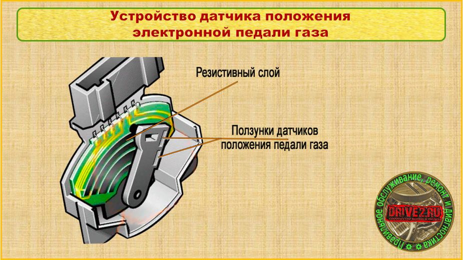 Принцип её работы прост. В самой педали чаще всего установлены два переменных потенциометра (резистора), на которые с ЭБУ приходит напряжение и в зависимости от угла положения педали газа, изменяется напряжение на её выводах, по которому ЭБУ понимает на какой угол вы нажали на педаль акселератора. Данный принцип позволяет избавиться от двух датчиков на дросселе, которые были принципиальны в тросиковой схеме. Забавно иногда видеть здесь людей, которые тщетно ищут на дросселе регулятор холостого хода.