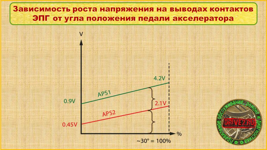 На схеме ниже видно, как изменяется напряжение при изменении угла нажатия на педаль газа. Угол нажатия в примерно 30° соответствует 100% нажатию на педаль газа.