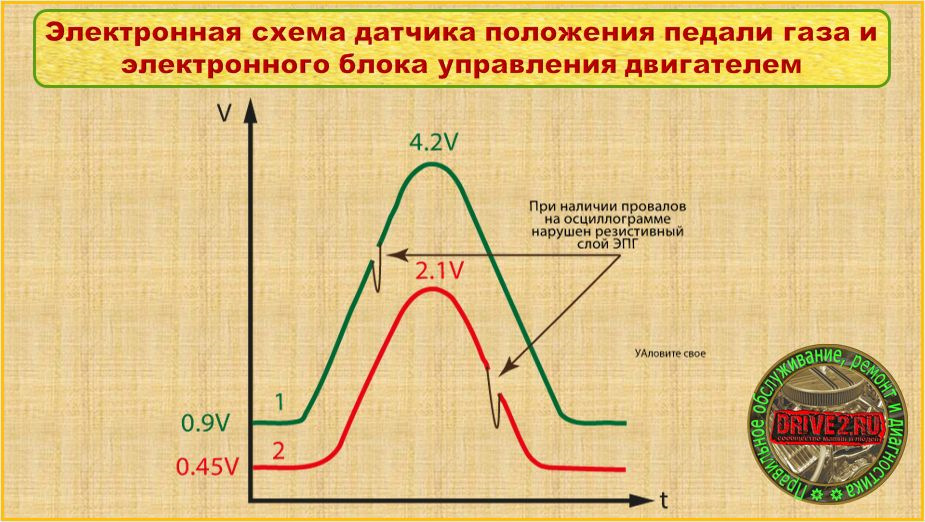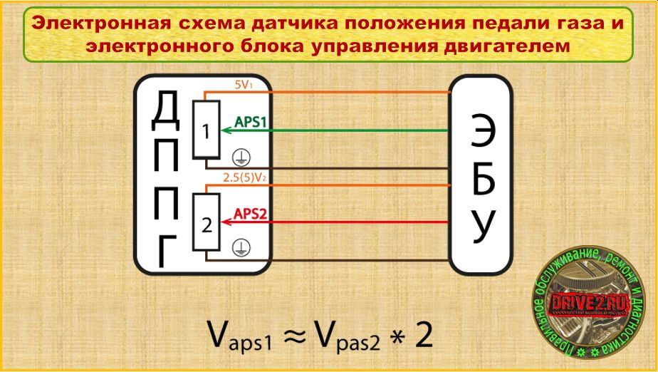За счёт сдвоенного сигнала ЭБУ двигателя получает достоверный сигнала о положении педали акселератора и может эффективно диагностировать её неисправность.