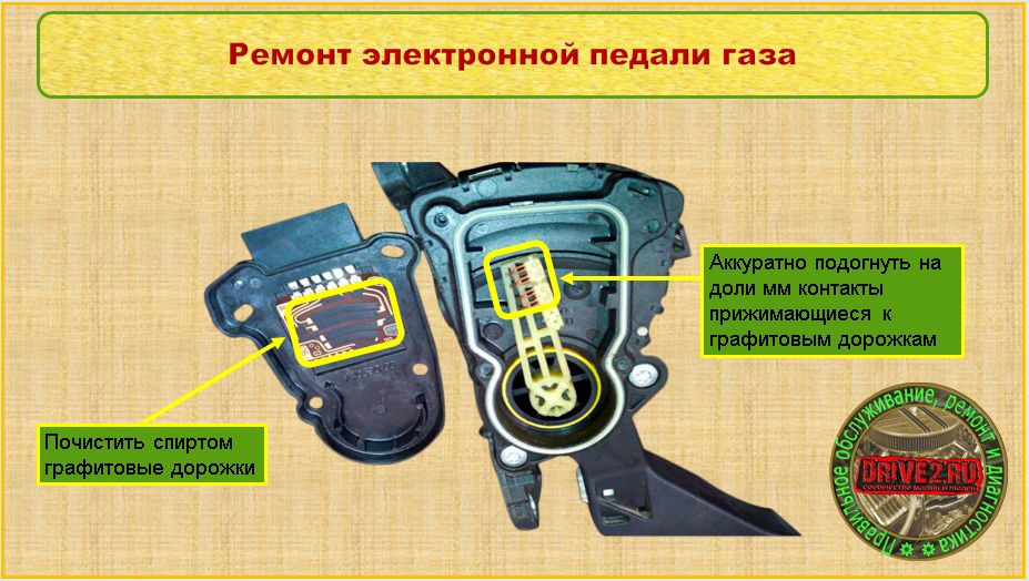 Ремонт ЭПГ. Снять педаль, затем крышку датчика, разобрать датчик, сняв бегунок с контактами. Промыть спиртом графитовые дорожки и аккуратно на доли миллиметров сдвинуть бегунки контактов, которые прижимаются к графитовой дорожке. Так как дорожки чуть толще самих контактов, то слегка сдвинув их, они начнут касаться слоя, который не был поврежден в результате трения в процессе работы датчика и как итог мы получим работающую ЭПГ. Некоторые ремонтируют их с помощью простого карандаша