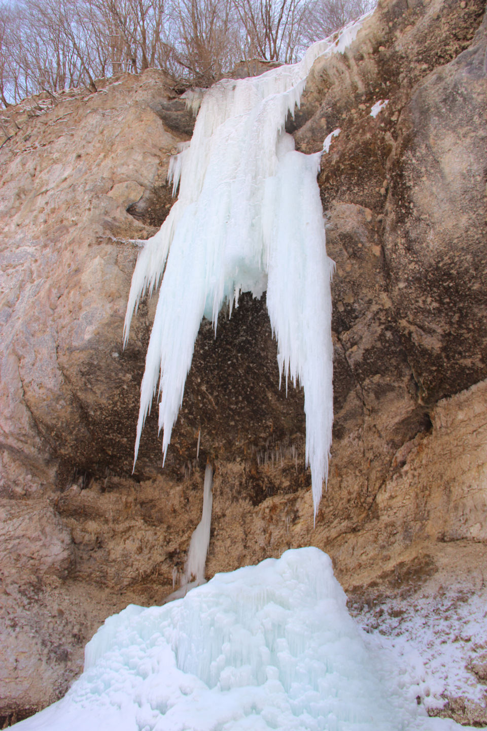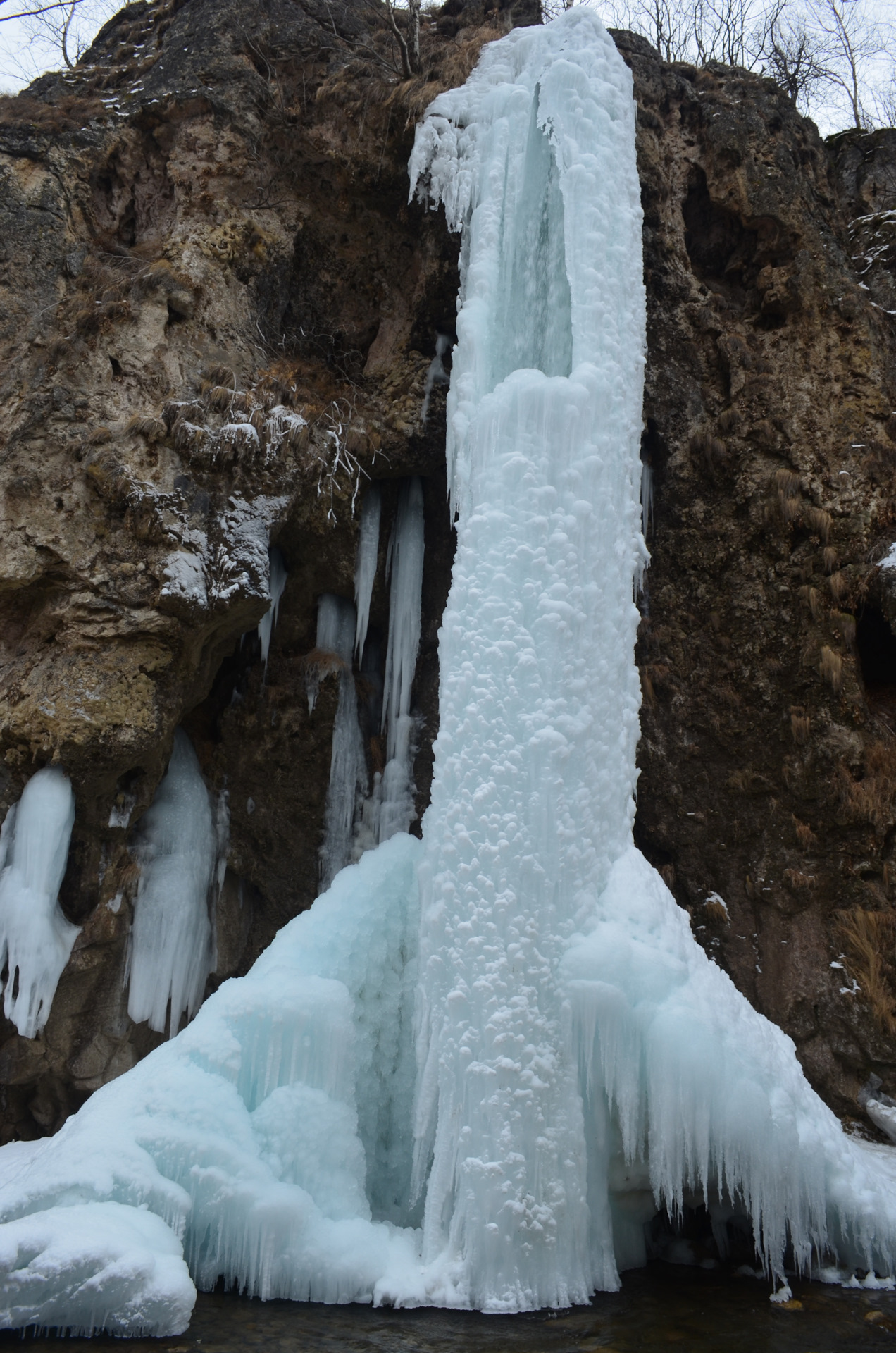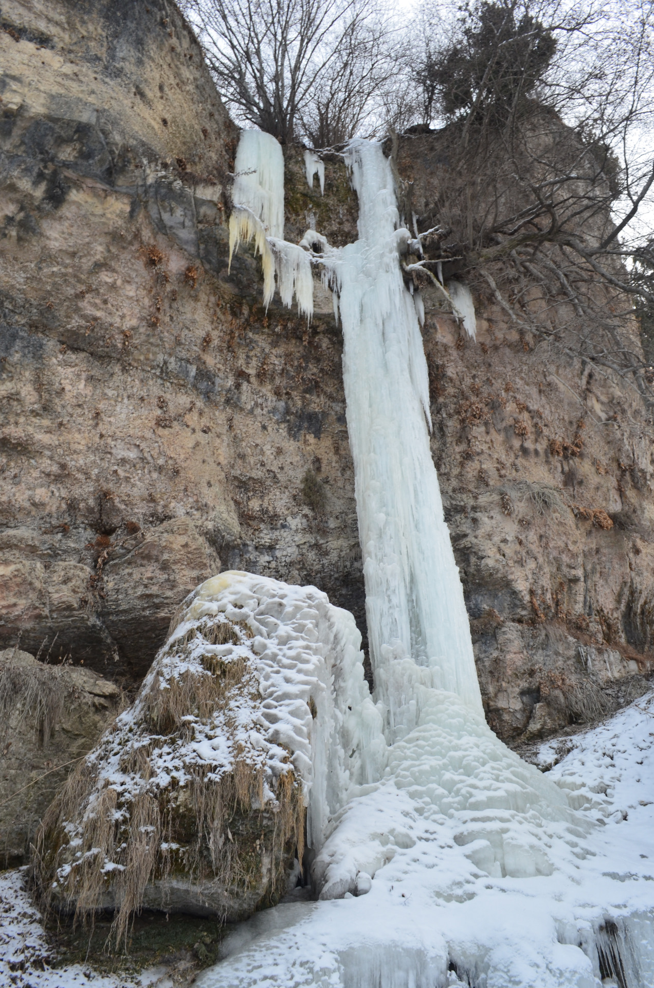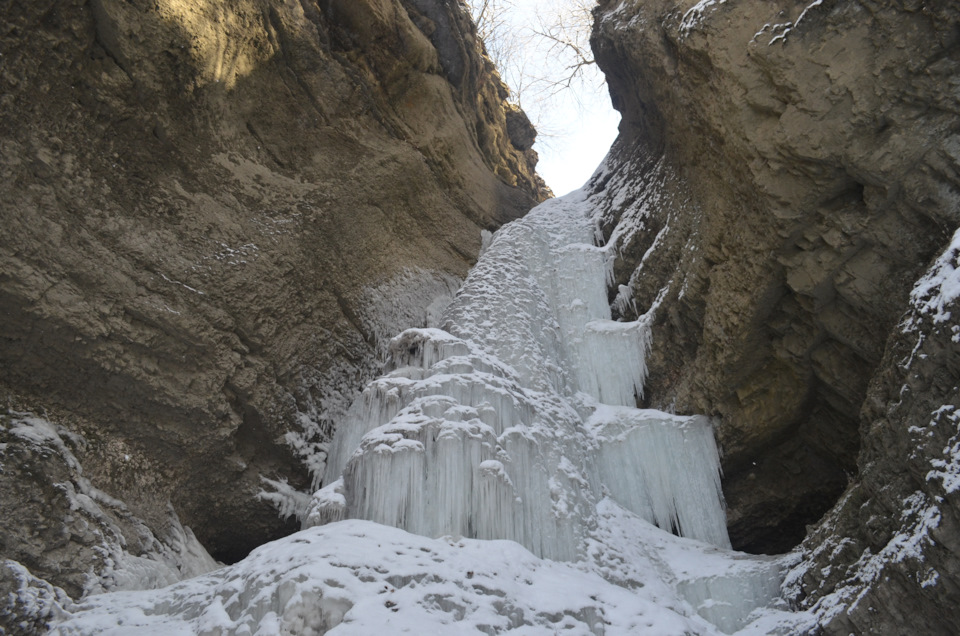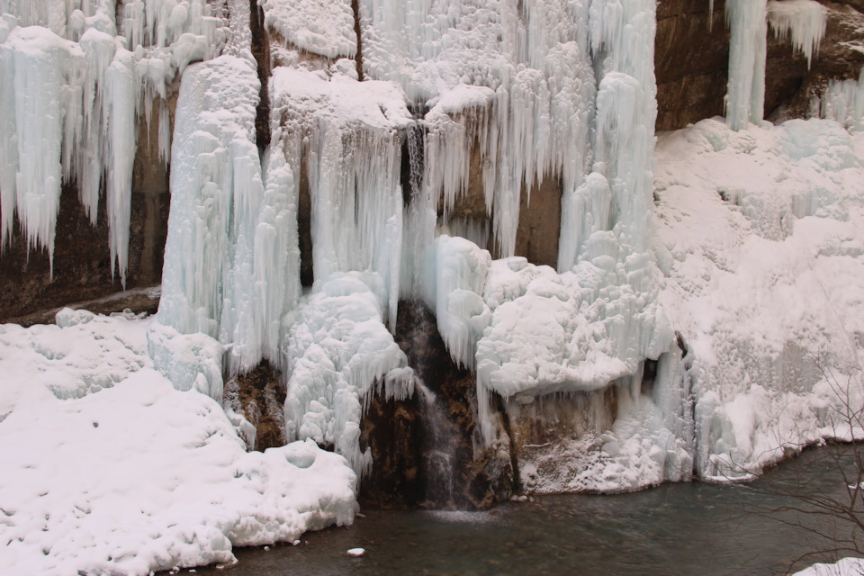 Малый чегемский водопад. Не могу объяснить почему, но до этой поездки я на него не заезжал, хотя он находится буквально в ста метрах от дороги и в достаточно красивом ущелье. Высота падения струи составляет 30 м и это самый мощный водопад каскада. Зимой он замерзает и выглядит очень даже симпатично, дорога к водопаду пролегает по дну ущелья, думаю, что летом тут нужно будет идти по реке, ну а пока под ногами твердый лед.