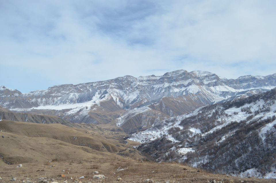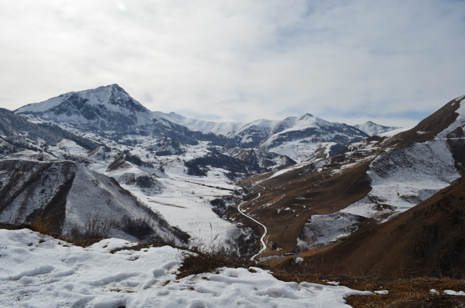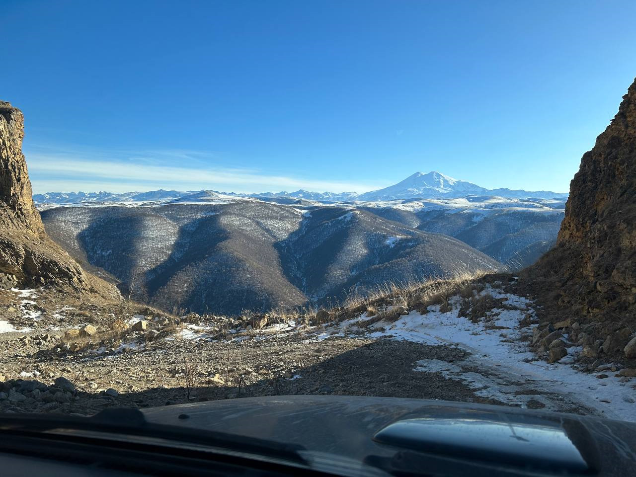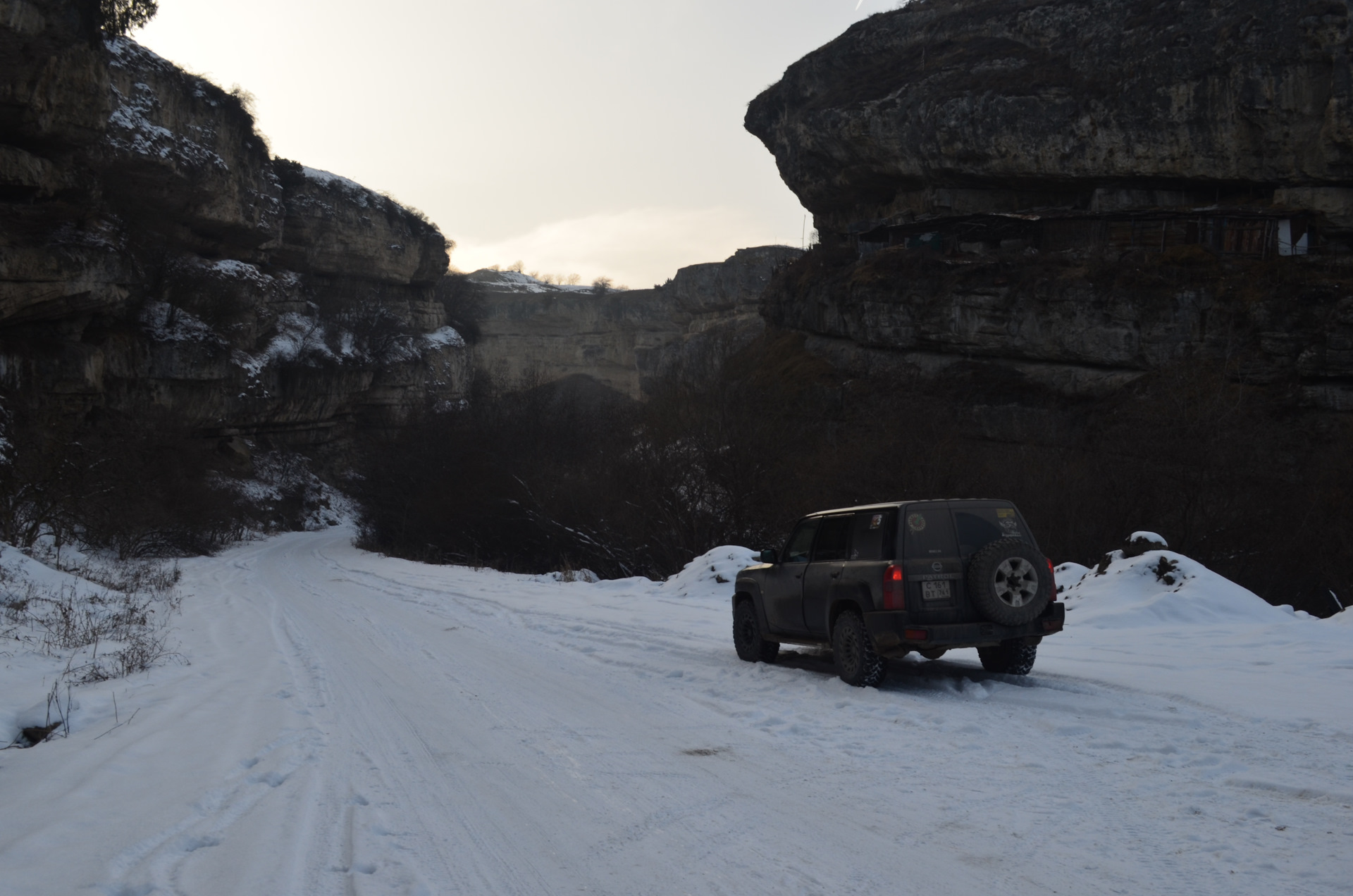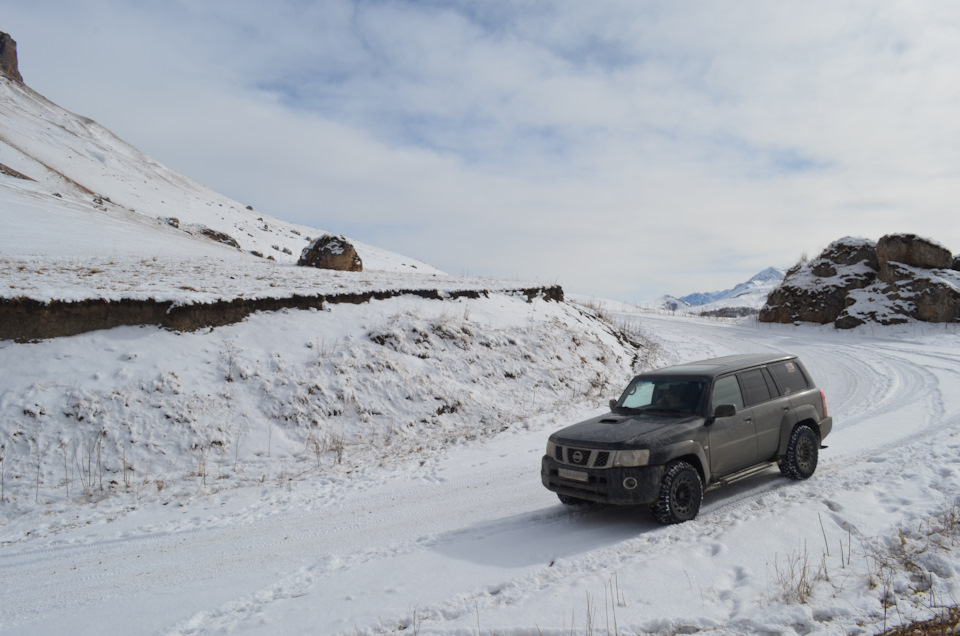 Сначала все ехалось хорошо, сантиметров 20 пухляка под колесами не создавали ни каких проблем. Машина с легкостью его проминала, небольшие затруднения вызывали только переметы из прибитого снега. Мы поднялись до 1350 м, дорога набирала высоту и делала поворот. В этом место мы уперлись в очередной перемет. Я пытался пробить его ходом, но под слоем пухлого снега находился толстый наст. Не смотря на оо что толщина его была около 5 сантиметров машину он не держал, тяжелый патрол проваливался ломая передними колесами и мостом наст, зарывался шинами в снег. Оставалось около 5 километров до Элькуша, но на участок около 300 м мы потратили час. Стало понятно что мы не можем себе позволить терять столько времени и решили возвращаться обратно по асфальту и часть пути объехать.