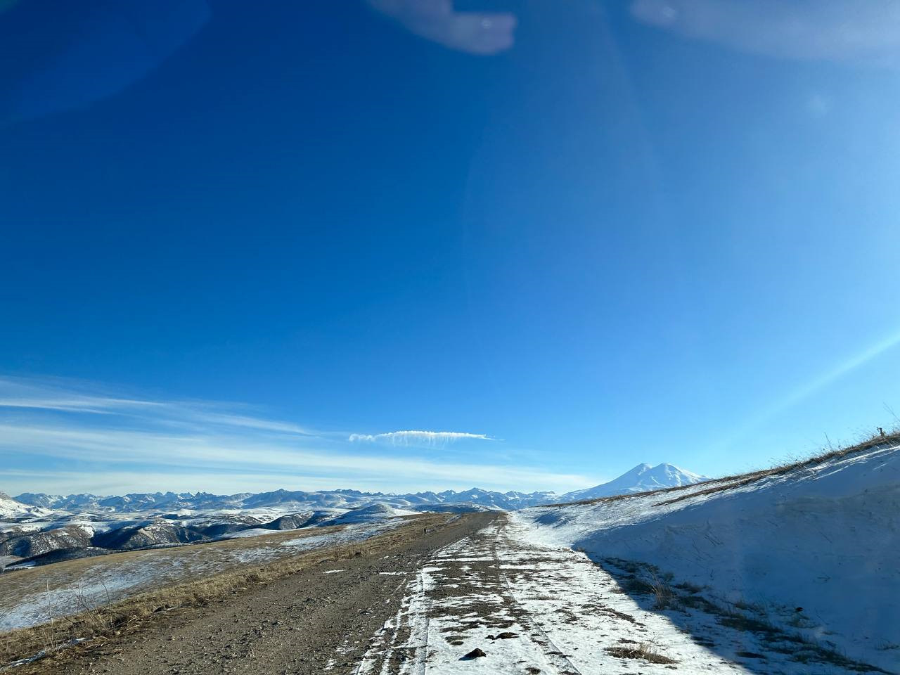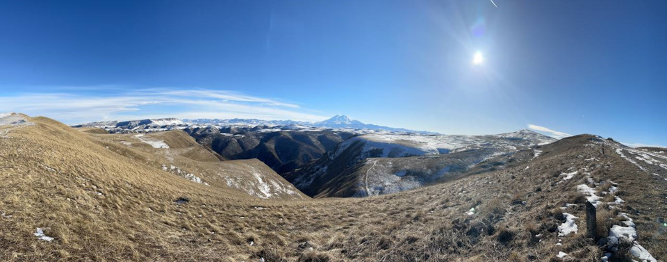 Спускаемся вниз по дороге, то и дело открывается вид на Эльбрус — главную вершину