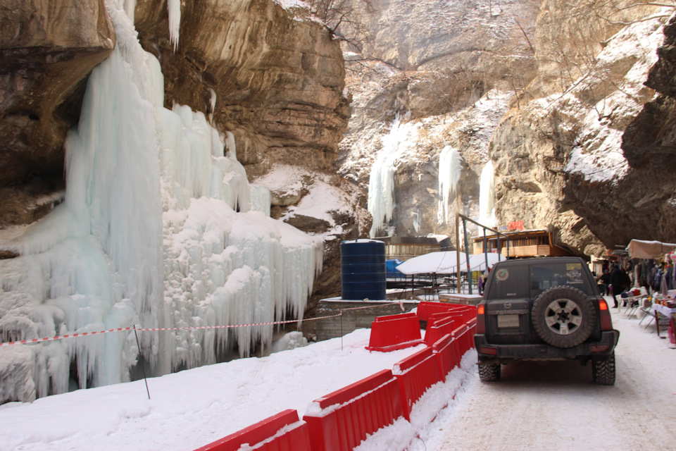 Тут нет ничего кроме природы. Нет кафе, нет лотков с носками и сувенирами, за то есть водопады, сейчас они были замерзшими и дорога была засыпана снегом. Летом она не должна доставить сложностей, а сейчас буквально в паре мест пришлось проехать с осторожностью