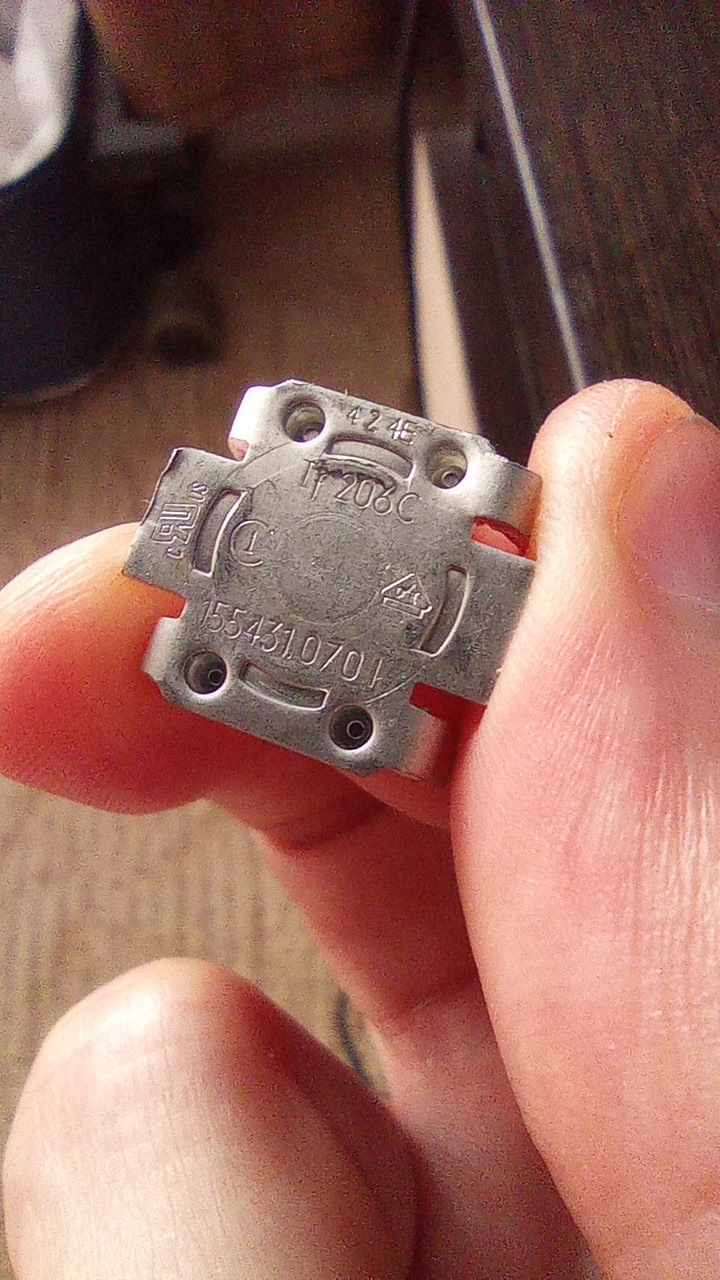 направо от разъема квадратик предохранителя, налево квадратик терморегулятора. оба открытого типа, поэтому очень ненадежные. режем ламели токопроводов и выкидываем регулятор, корпус предохранителя пригодится, чтобы прижать новый предохранитель, от него снимаем алюминиевую жопку и вынимаем потроха.