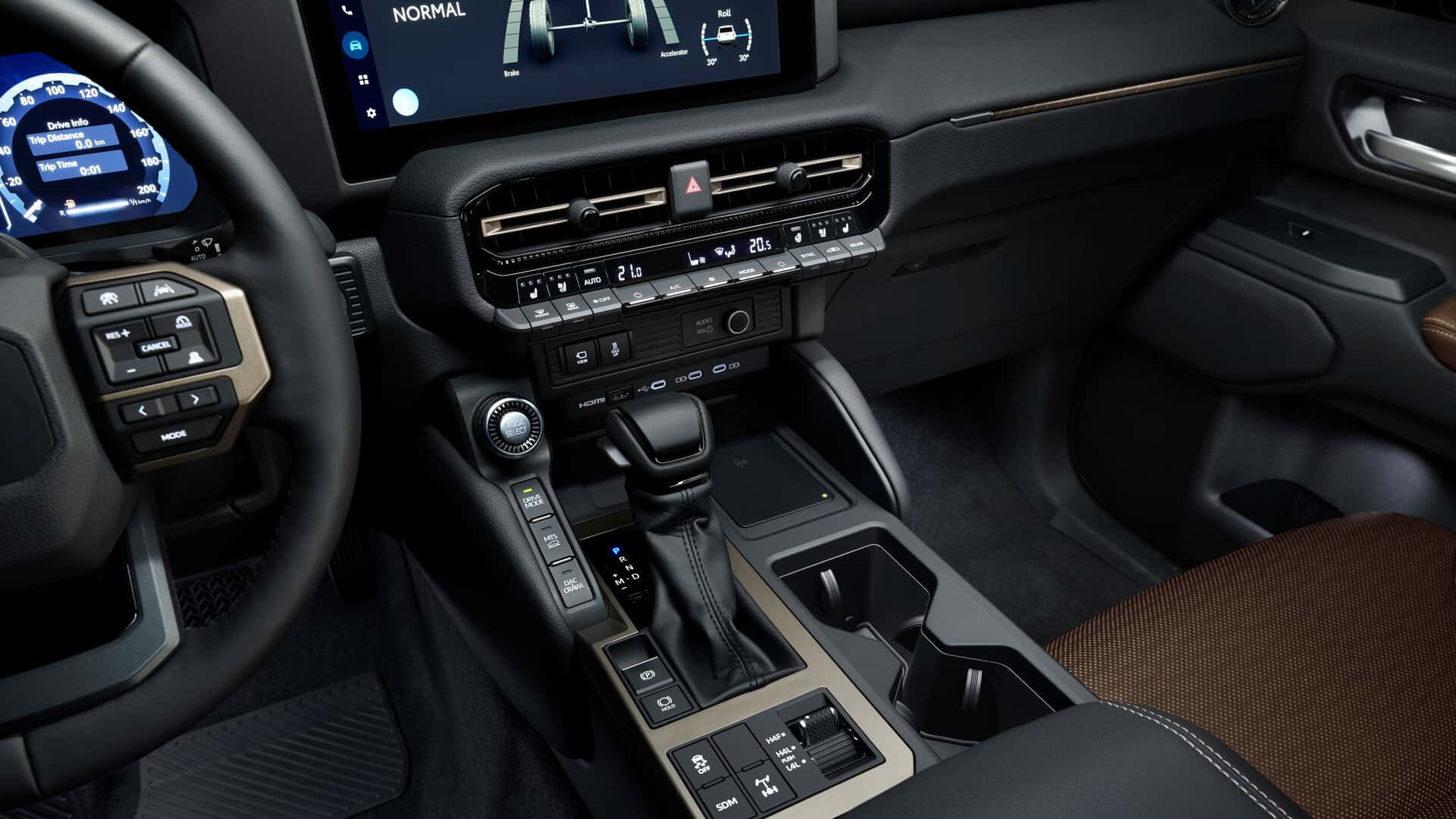 Внутри Toyota Land Cruiser Prado нарочито скромный. В базовой версии у внедорожника медиасистема с 8-дюймовым тачскрином и шестью динамиками, тканевый салон, механические регулировки кресел, простой чёрный пластик и только пять мест. Из «бесплатных» опций — подогрев руля и передних кресел, беспроводная зарядка для гаджетов и инвертор переменного тока на 2400 Ватт.