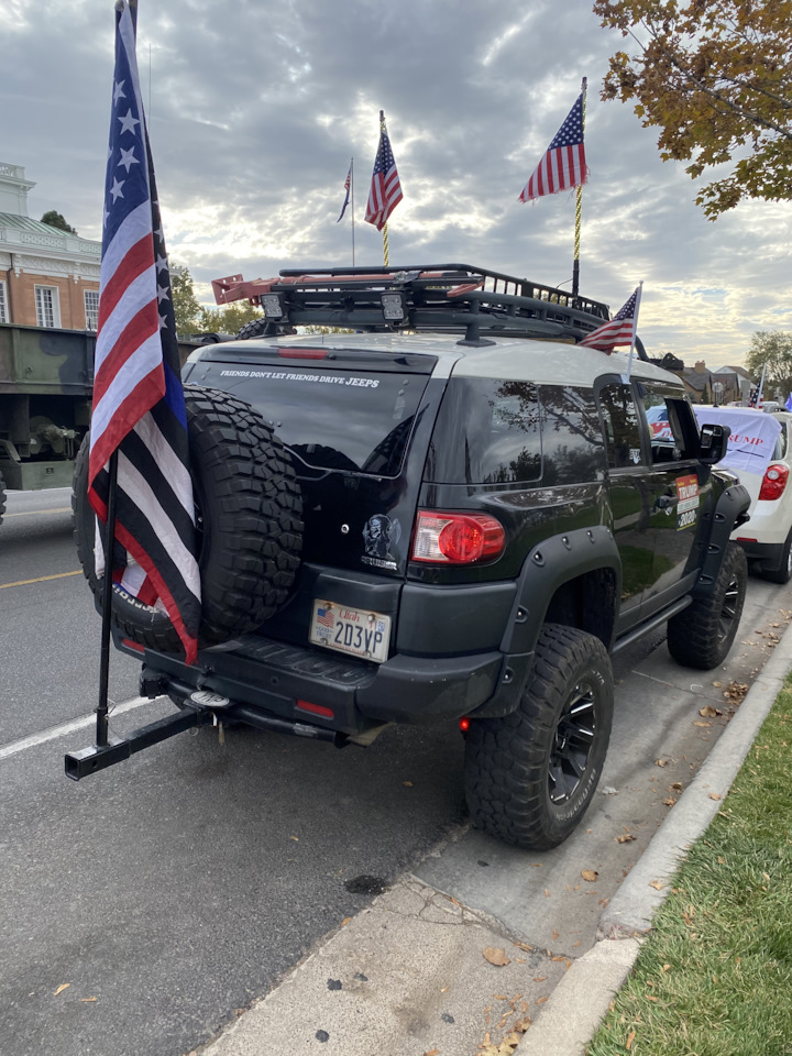 Надпись заднем стекле FJ Cruiser: друзья не позволяют друзьям водить Джипы. Так же недавно видел в Инстаграме видео с 4Runner и закадровым (дикторским) голосом который говорил: "4Runner это как Jeep, только для мужчин". Вот где настоящая автомобильная война :)