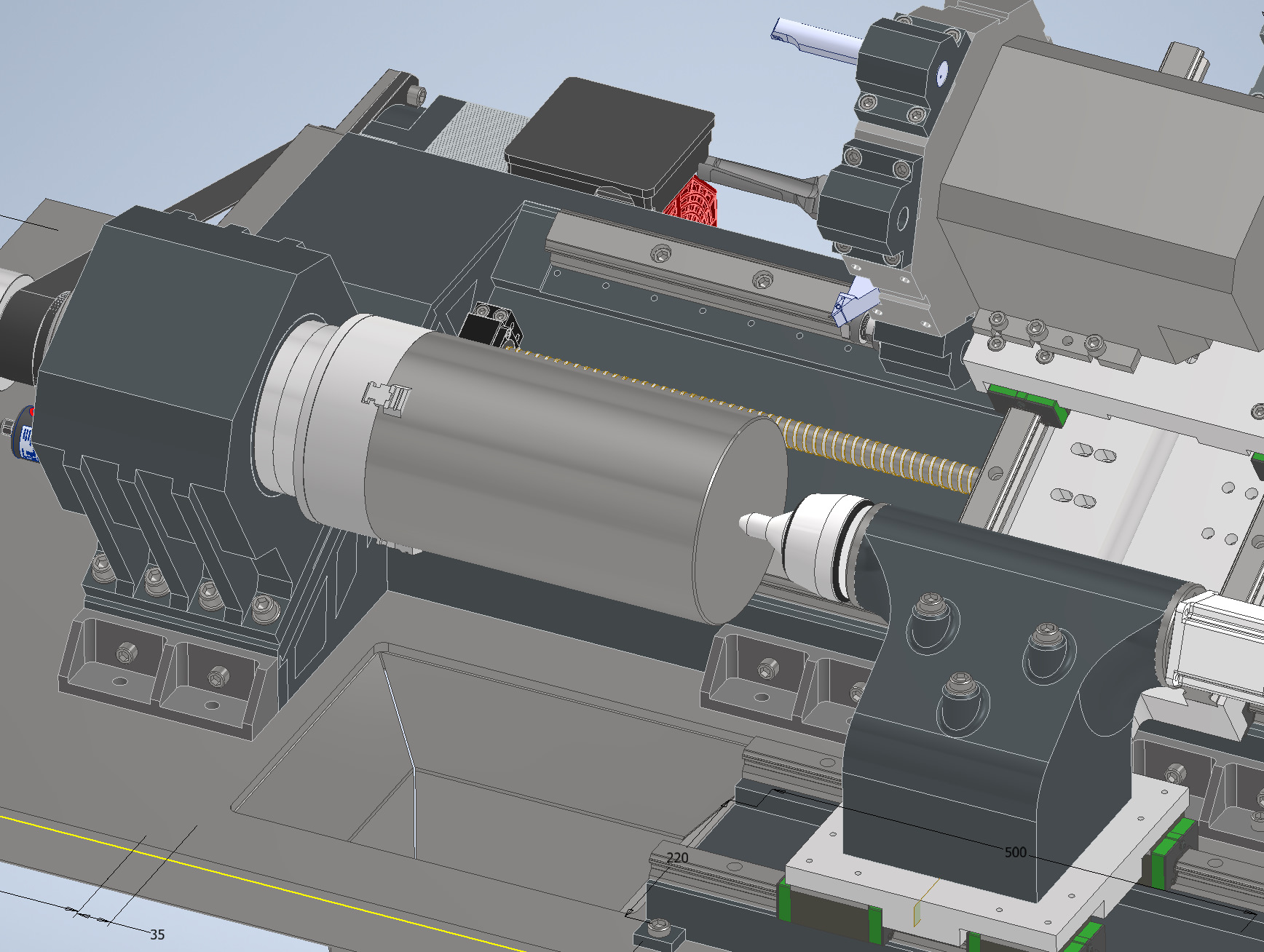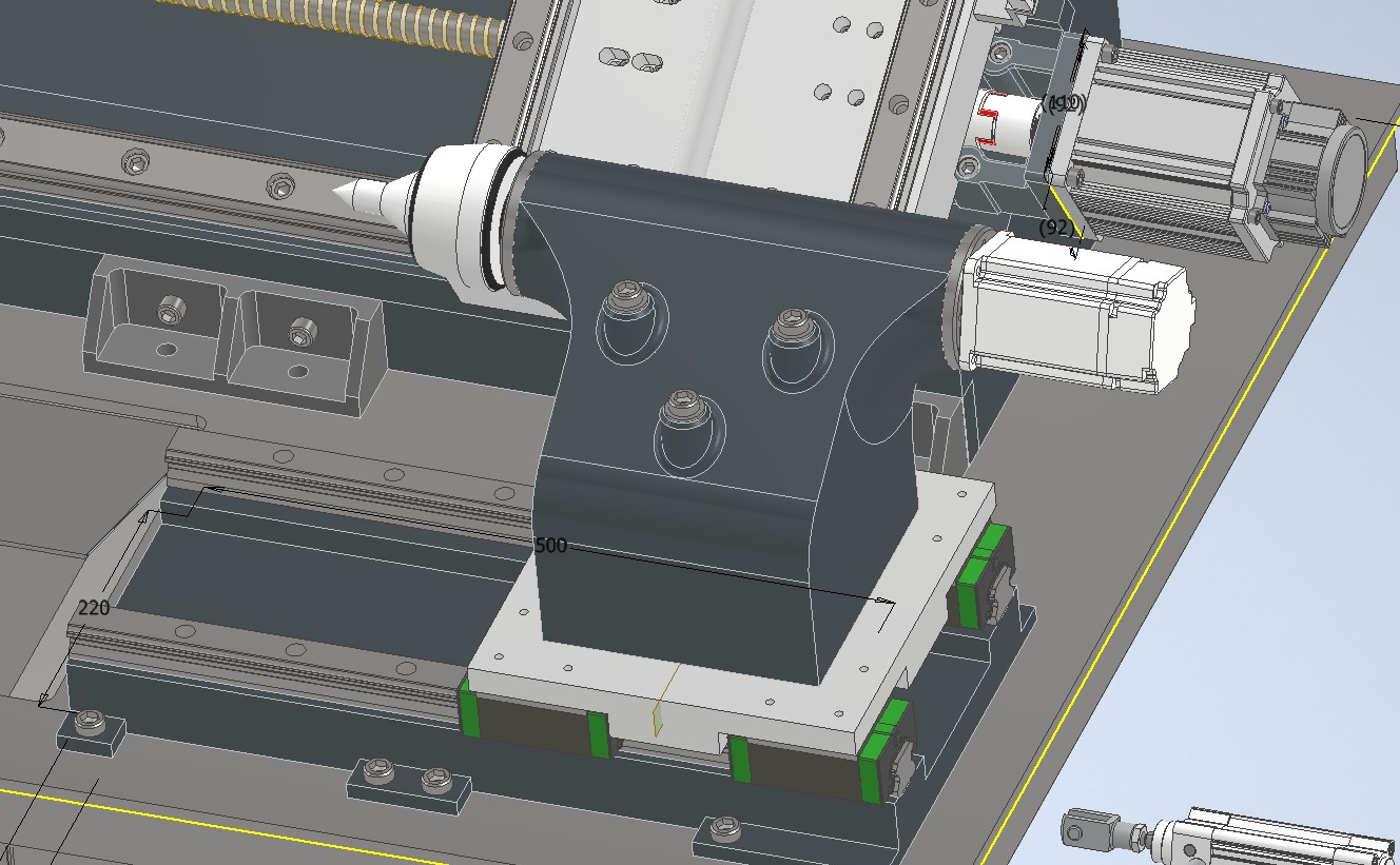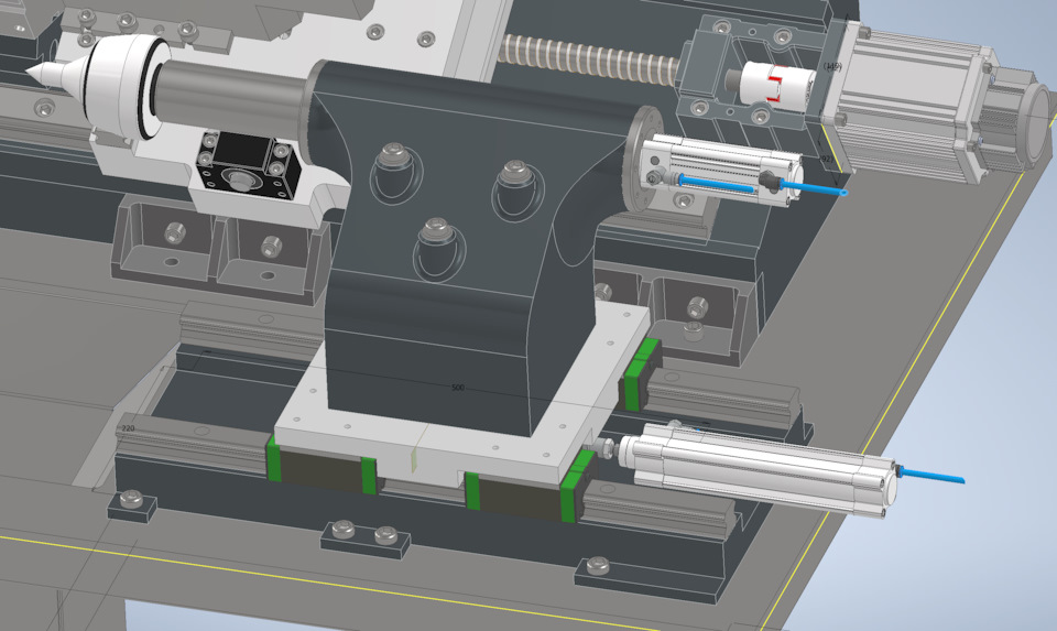 второе, поджим задней бабки, …у тебя каретки рельс без подачи масла? без поджима маслом?..если с подачей масла то можно и гидроцилиндр воткнуть, если все таки воздух, то у тебя же цилиндр достаоочно большого размера можно спрятать под бабкой а не как у тебя на моделе. ну и в чем проблемма сделать цилиндр хоть такой хоть такой самостоятельно использовав детали от автомобильного амортизатора к примеру? (кстати какие то воздушно/гидравлические у меня есть, могу задарить)