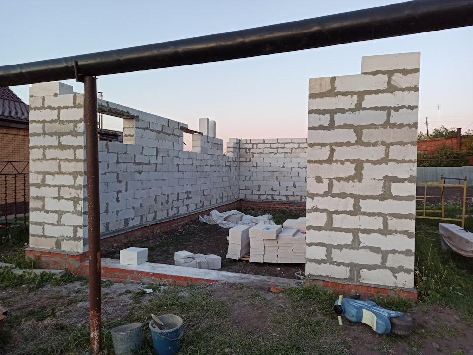 Сейчас на этапе строительства стен из пеноблока толщиной 300 мм. Размер внутри 5*10 метров. Высота стен 3 метра. Будет армопояс размером 200*250 мм.