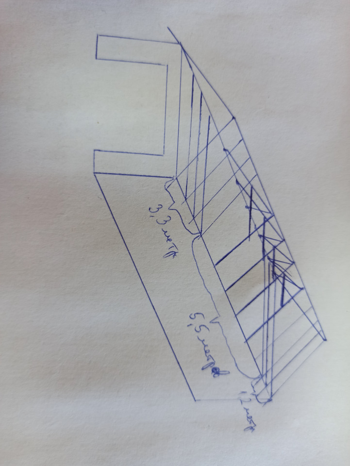 Не специалист в черчении. Пролёты 3.3 и 1.2 метра будут стандартным треугольниками (балки перекрытия и страпила), а пролёт 5.5 метров будут страпила в виде буквы "А"