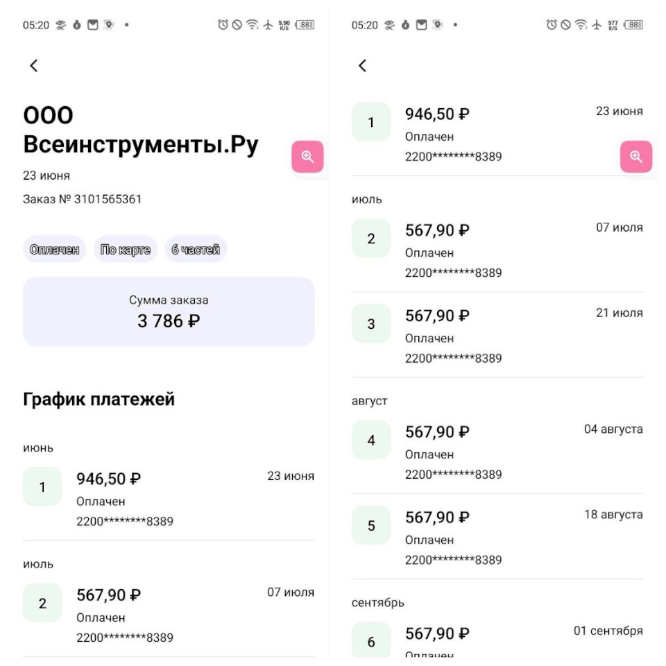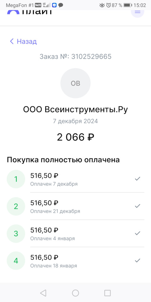 Рассрочка выплачена полностью., деньги снимались каждые 2 нелели точно в срок, за один день приходит напоминание, чтобы баланс был положительный на карте, для нужной суммы. Я заранее оставил на карте сумму с запасом.