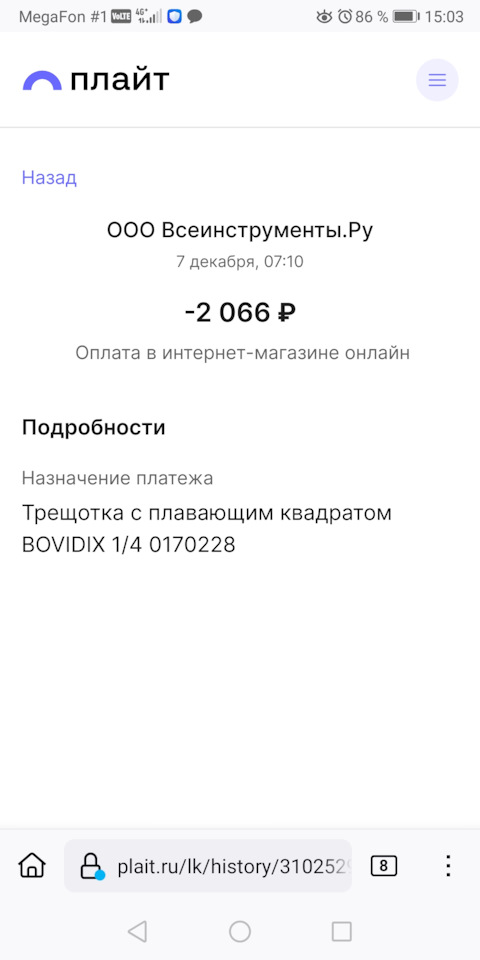 Платёж снимался как покупка в магазине ВСЕ Инструменты, и баллы, кешбек тоже прибавлялись в копилку.