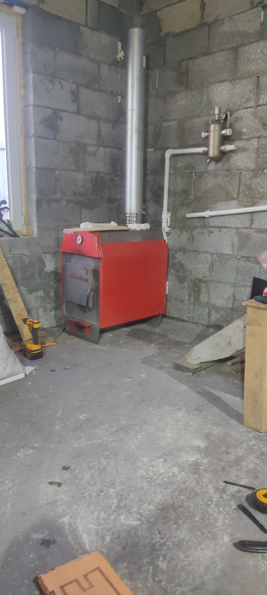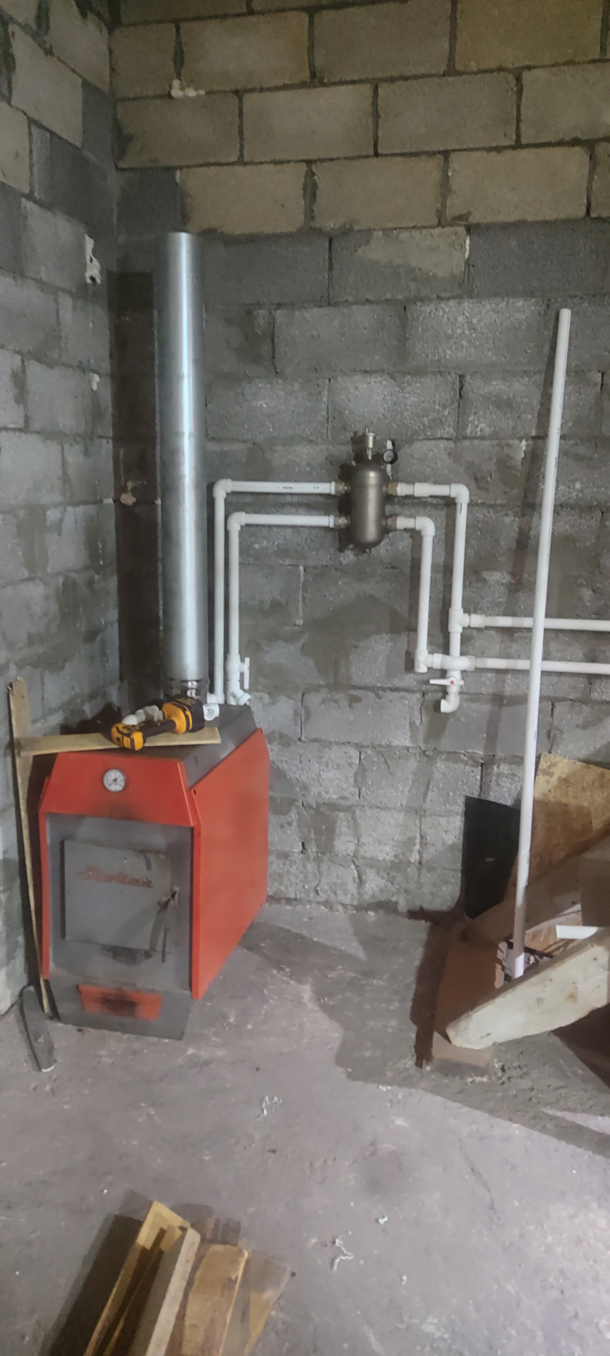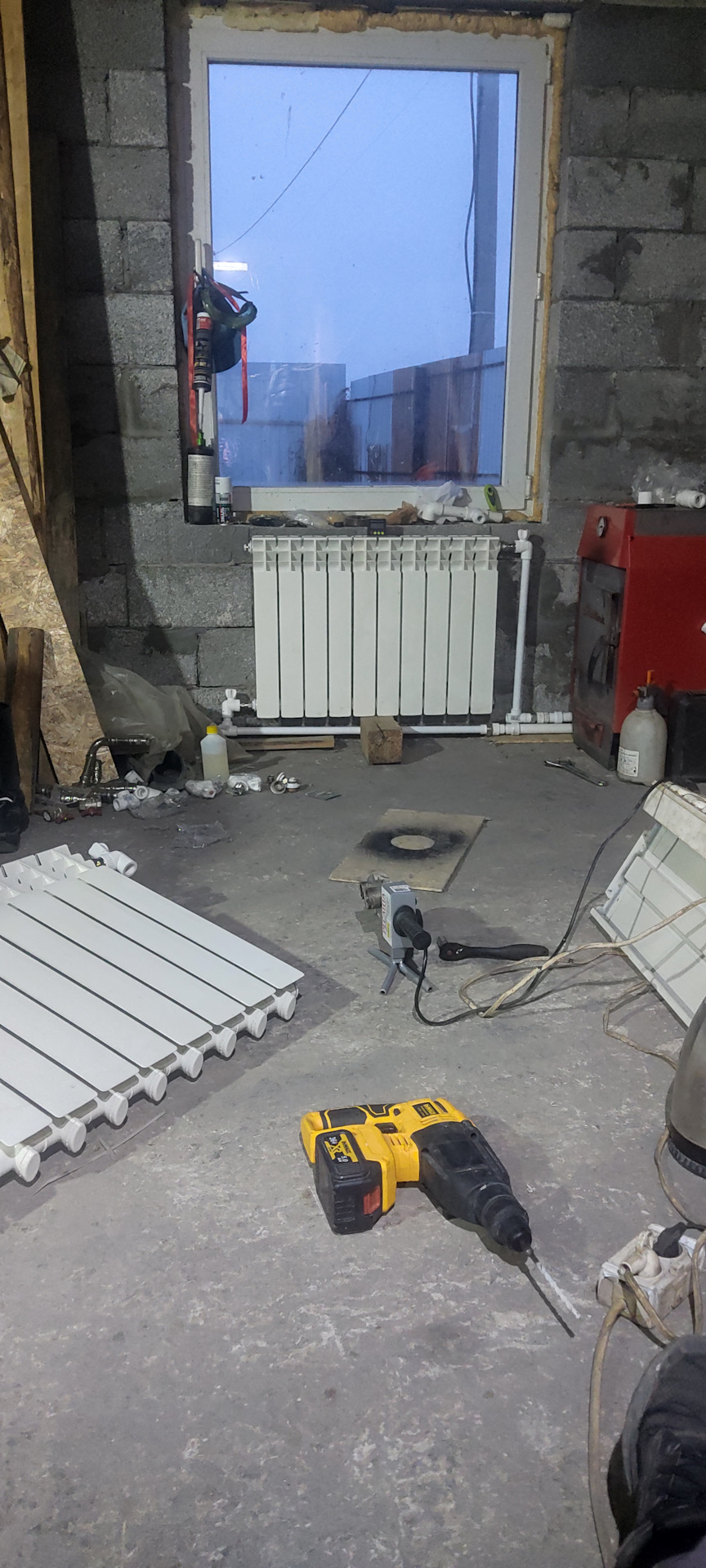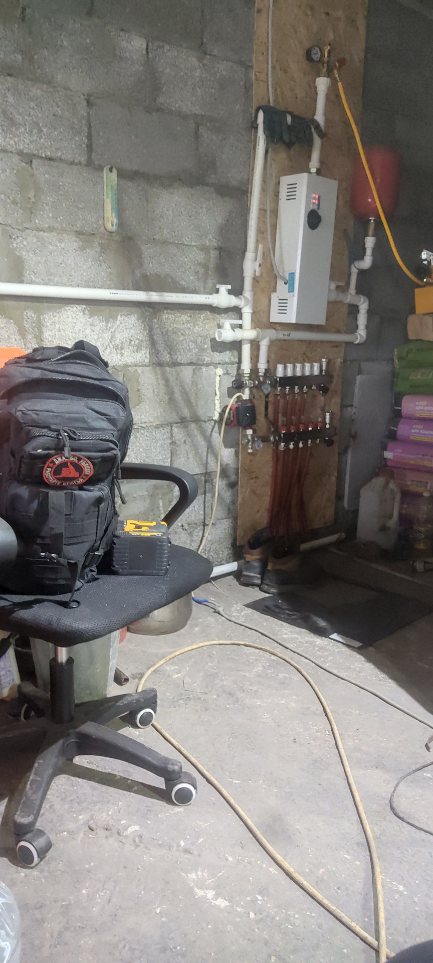 из предыдущей записи www.drive2.ru/c/693103543921418526/ понятно, что по всему периметру тёплый пол, в этой записи пойдет речь про установку дровяного котла и батареи, так же, из предыдущей записи, будет понятно, что 10 кВт котел, заменён, на удачно подвернувшийся в продаже 20 кВт, с автоматикой и установленным тэном на 6 кВт, на следующий сезон, перенесу всё управление на один котёл, а настенный уберу, но как показала небольшая практика использования, три батареи (10+10+4 секций) для него мало, прикрываю краны и основной поток идёт в теплый пол, думаю, что надо добавить ещё как минимум пару радиаторов по 10 секций на противоположную стену и немного перепаять обратку с контура тёплого пола, но этим займусь по окончанию отопительного сезона.