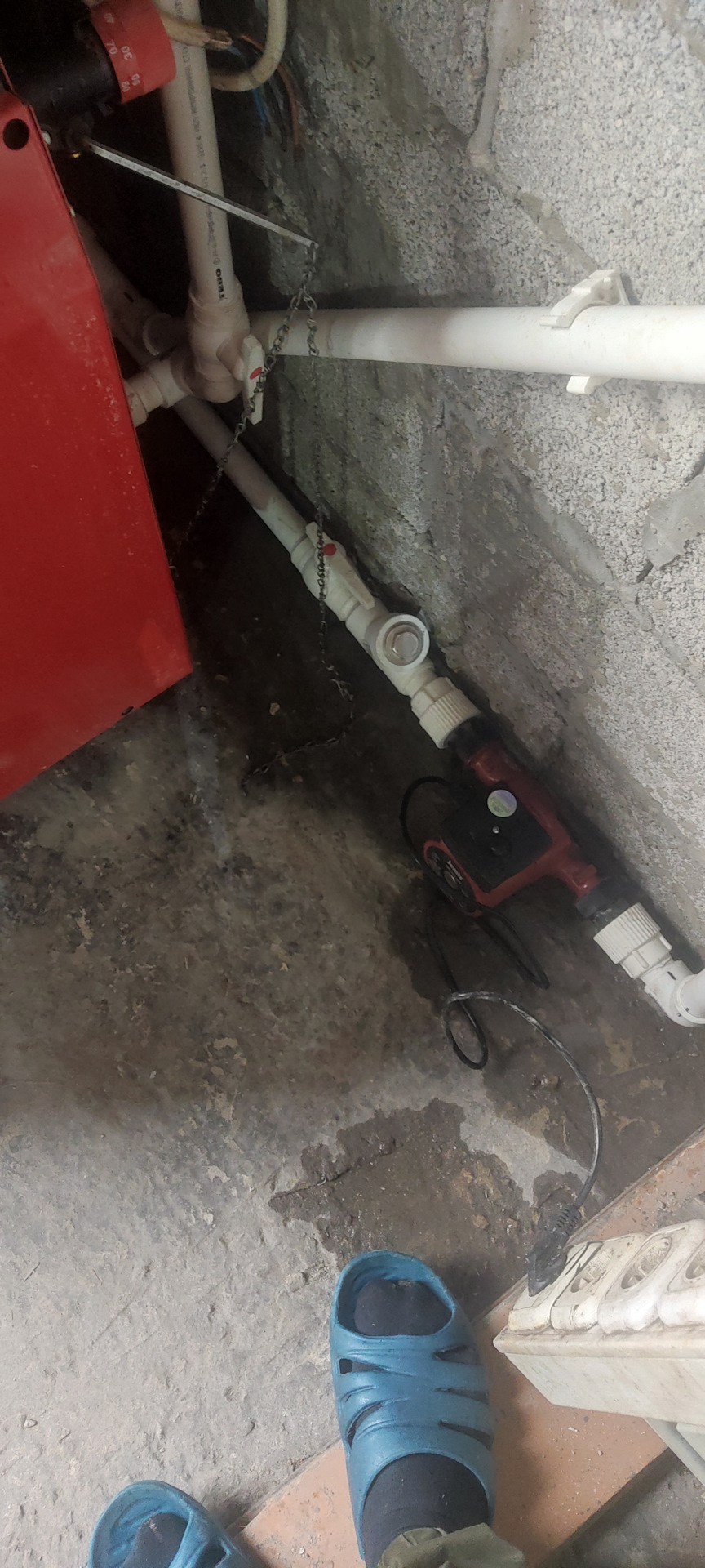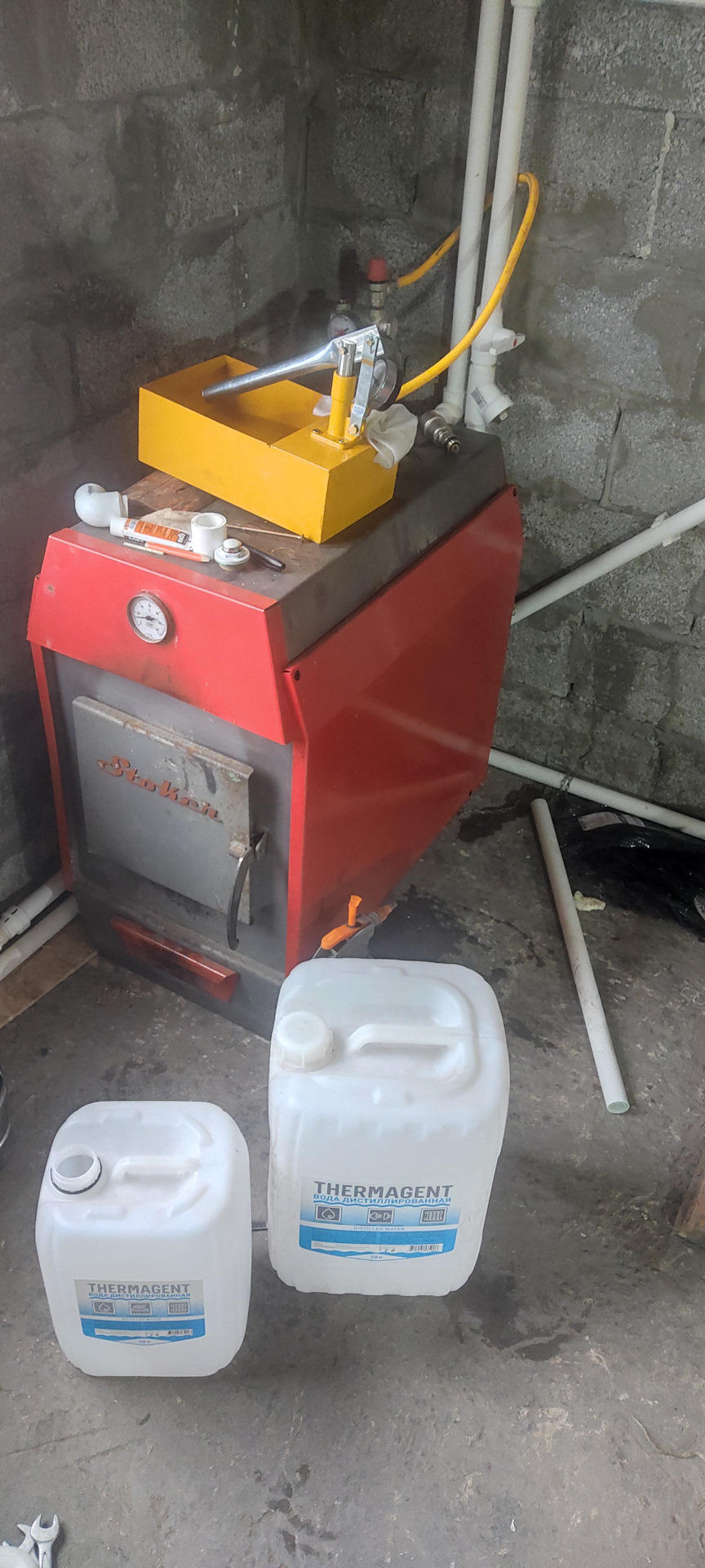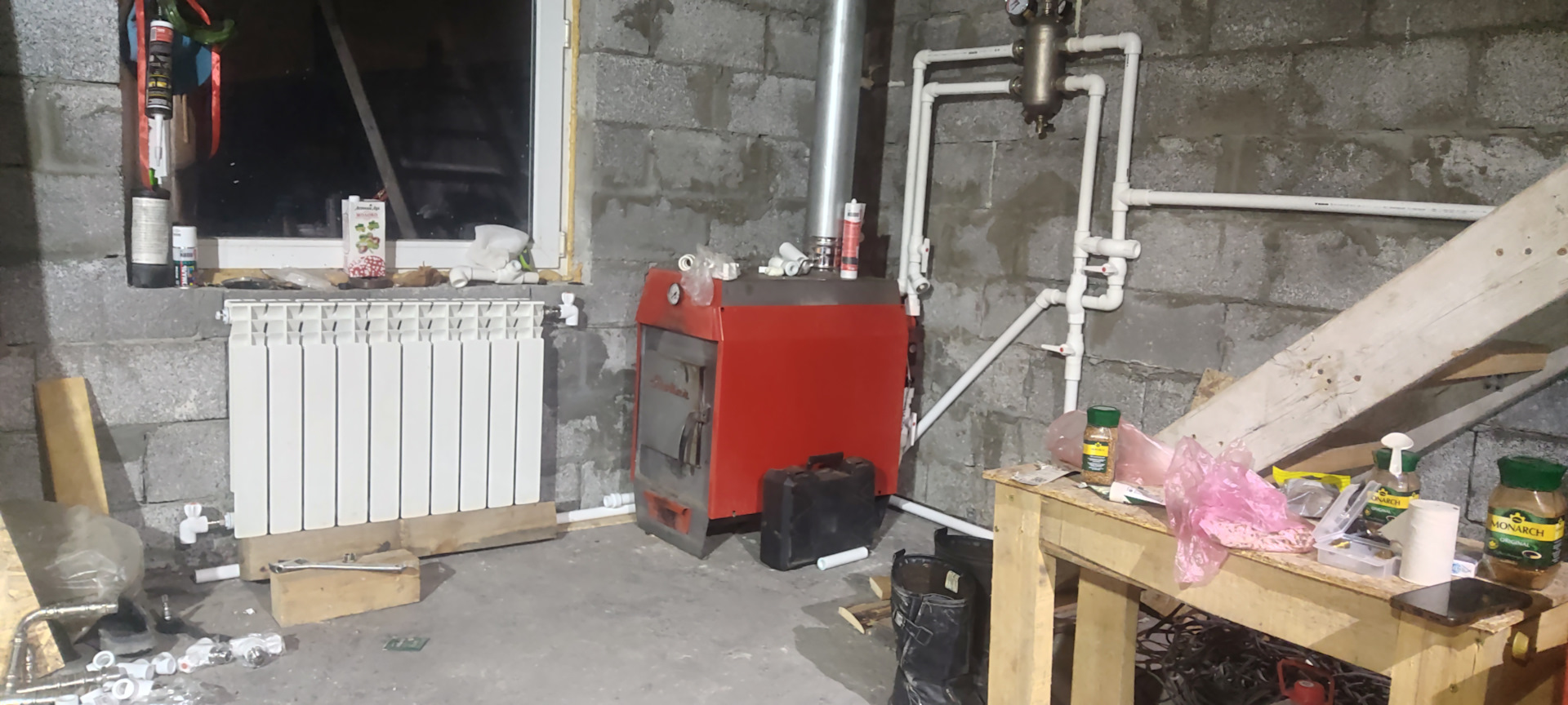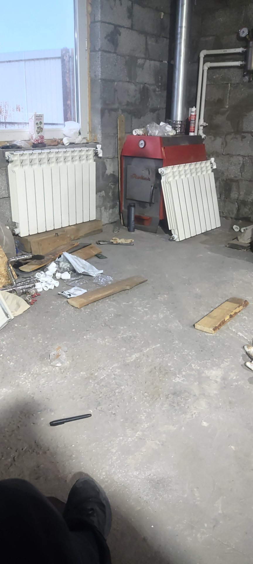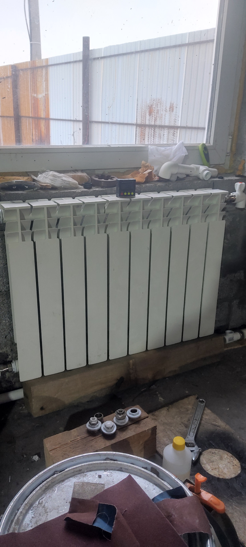из предыдущей записи www.drive2.ru/c/693103543921418526/ понятно, что по всему периметру тёплый пол, в этой записи пойдет речь про установку дровяного котла и батареи, так же, из предыдущей записи, будет понятно, что 10 кВт котел, заменён, на удачно подвернувшийся в продаже 20 кВт, с автоматикой и установленным тэном на 6 кВт, на следующий сезон, перенесу всё управление на один котёл, а настенный уберу, но как показала небольшая практика использования, три батареи (10+10+4 секций) для него мало, прикрываю краны и основной поток идёт в теплый пол, думаю, что надо добавить ещё как минимум пару радиаторов по 10 секций на противоположную стену и немного перепаять обратку с контура тёплого пола, но этим займусь по окончанию отопительного сезона.