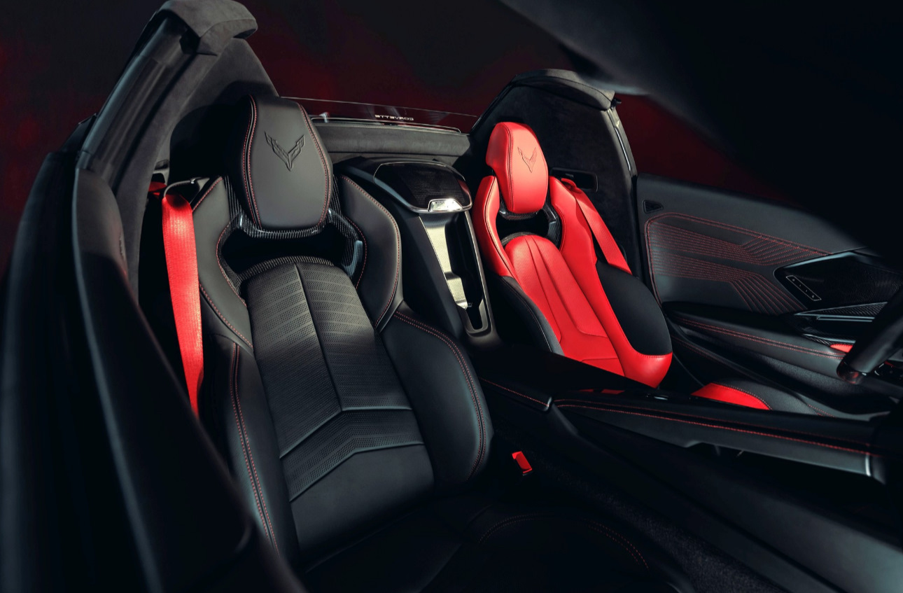 Салон у Corvette ZR1X уже обновлённый, 2026 модельного года, то есть с тремя экранами на передней панели и уменьшенным количеством физических кнопок. В отделке широко используется углепластиковый декор. Можно заказать разный цвет обивки для водительской и пассажирской стороны.