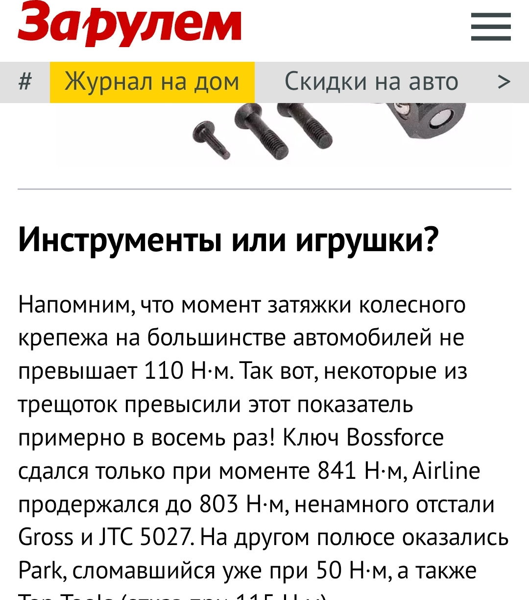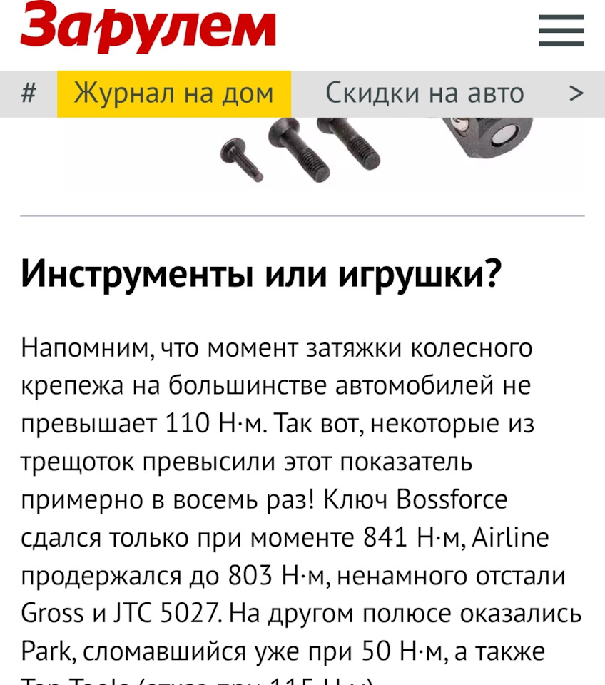 Но каково же было мое удивление от нового теста ЗР www.zr.ru/content/article…uyma-ekspertiza-za-rulem/, где они зачем-то начали эти трещотки проверять на прочность! Это же трещотка, это заведомо ее гибкое и слабое место! В их статье даже самая плохая трещотка (которая согнулась) дала слабину аж при 190 Н·м, но такое усилие человеческой рукой без палки не реализуешь! И вот тогда задается вопрос: а в чем вообще был смысл такого теста? Кто чем может поделиться, напишите!