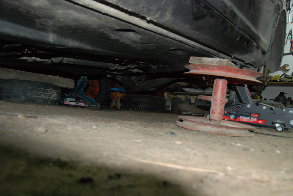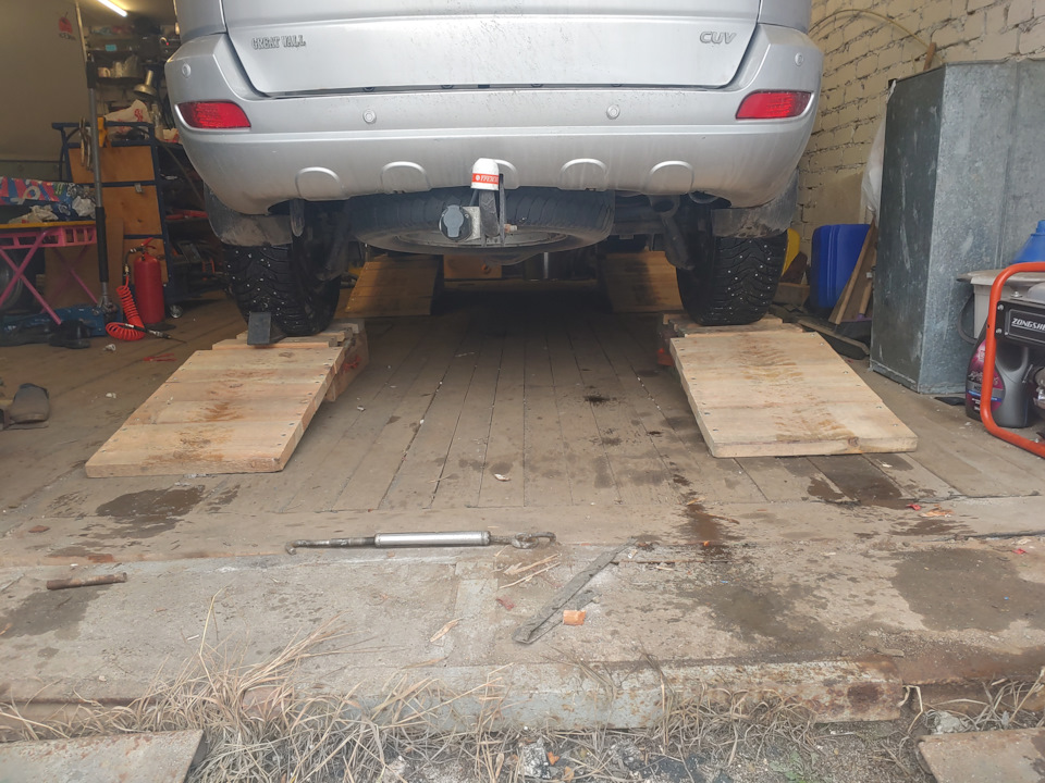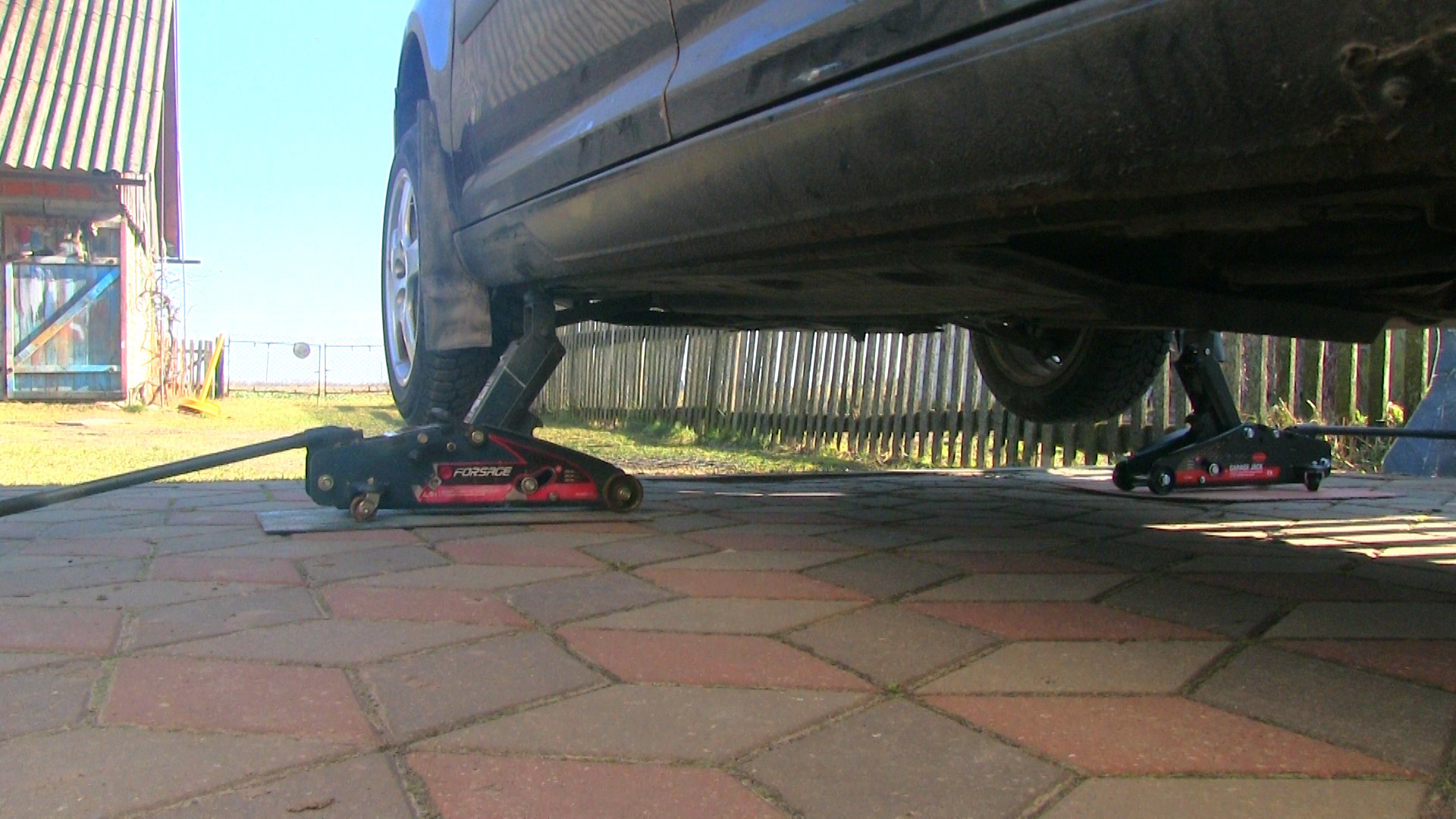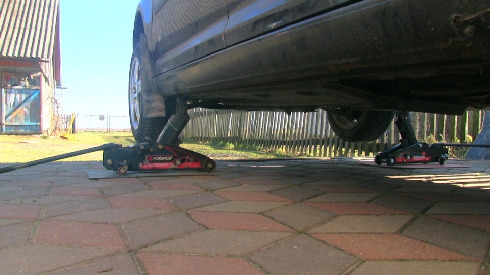 В моем случае пользуюсь двумя подкатными домкратами. Есть и эстакада за гаражом с заездом по доскам на газосиликатные блоки. Но в этом году все ремонты были только на подкатных домкратах. Есть важный плюс в том, что обе подвески навесу. Можно даже включить передачу и проверить работу МКПП.