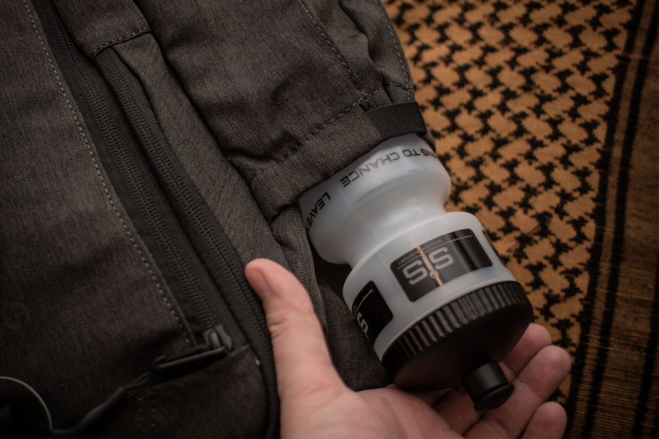 Боковые карманы — двойные — с загрузкой сверху и потайным карманом снизу снизу. При загрузке сверху все по классике — влезает бутылка с водой или ветровка.