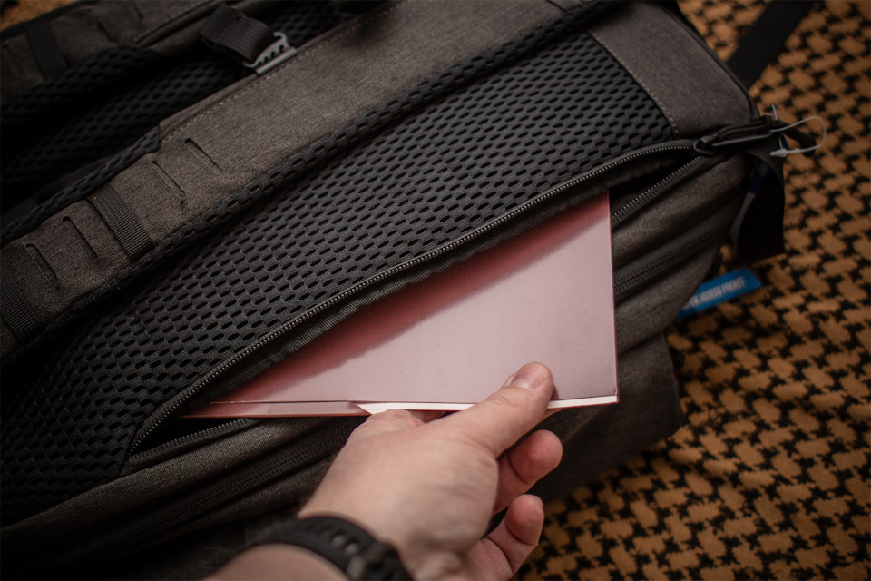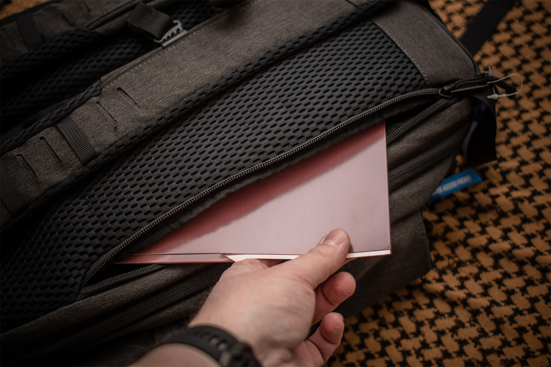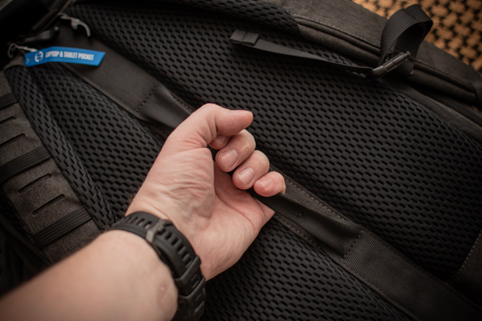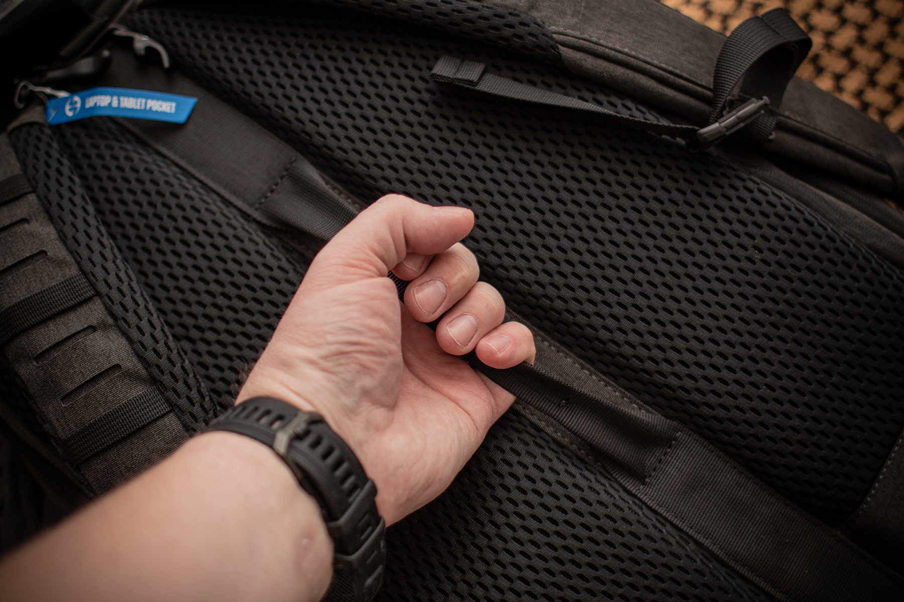 Рюкзак имеет жесткую спинку с развитой анатомией. Да, многие не очень любят эту пористую структуру на спине и лямках. В полевых и туристических условиях забивается грязью, впитывает пот и потом воняет. НО мы говорим про городское использование, где это не столь актуально. А вот как раз вентиляция и комфорт — важны.