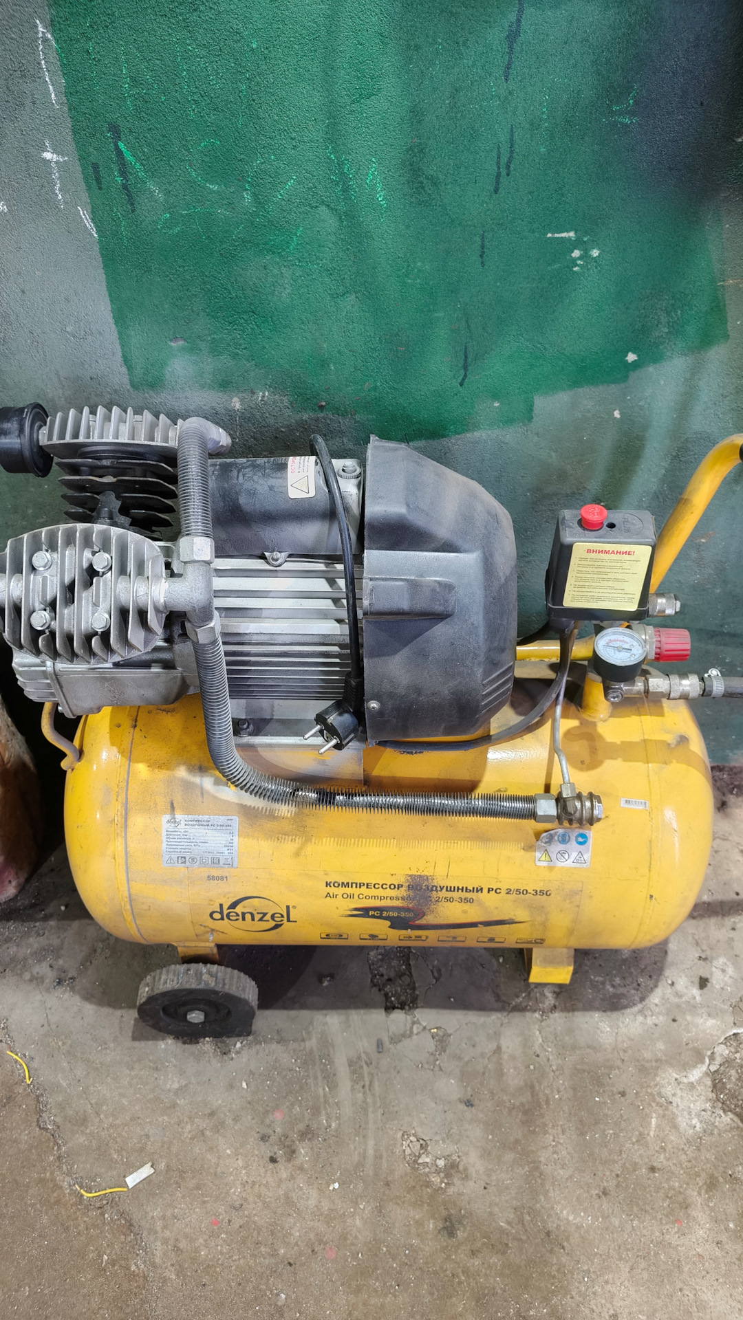 У меня такой же двух поршневой ))) двигло 2,2 кВт .с магазина сразу же поменял кондер на немного помощнее . Летом без проблем пускается, а вот в зиму стоит в гараже и на холодную в мороз уж очень тяжко ему ))) Просто спускаю разово весь воздух и с пустым баком запускается, потом уже прогретый запускается с пол пинка )))