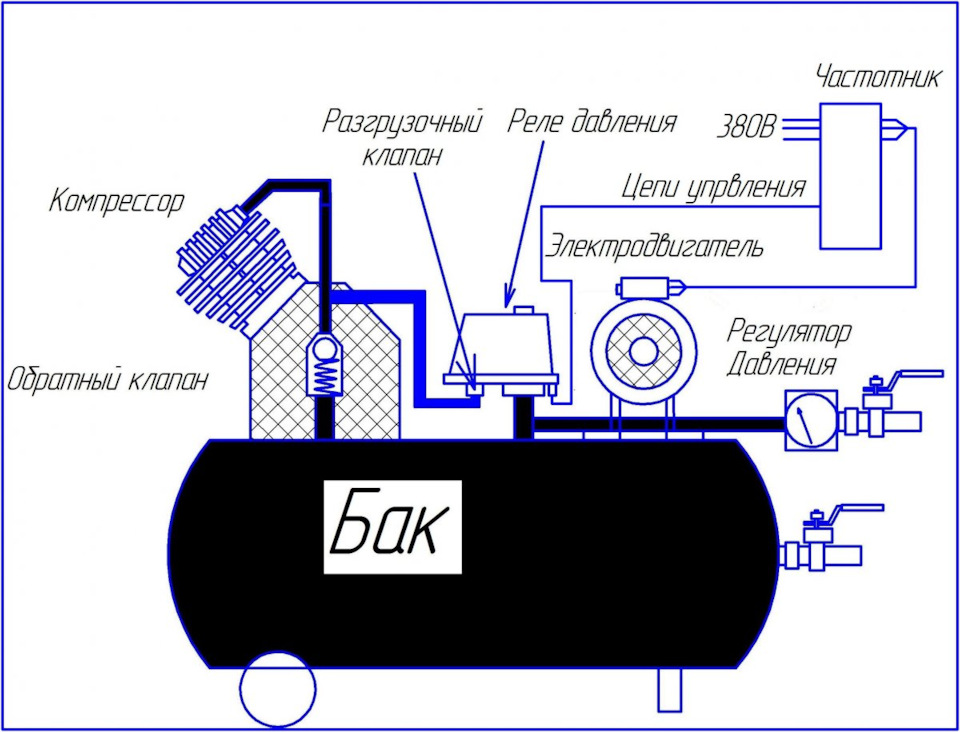Этот обратный клапан создает сопротивление его тоже так скажем на холостых тяжело продавить даже с пустым ресивером, чтобы он мог выйти на рабочие обороты. Отдельный маленький ресивер дает время на холостую работу компрессора, а уже когда магистраль набрала давление с этим маленьким ресивером, то открывается этот клапан в основной. А так магистраль маленькая, при запуске компрессор в стену пытается качать и ему тяжело