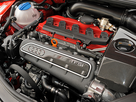 Это не мотор, а настоящий буян. Построенный на основе блока «пятёрки» 2.5 от американской версии седана Volkswagen Jetta двигатель оснащён непосредственным впрыском и большим турбокомпрессором с пиковым давлением 1,2 бара. Результат (340 л.с. и 450 Н•м) способен заставить дрожать коленки у кого угодно. Шутка ли: 4,6 секунды до сотни (для родстера — 4,7 с), а если снять электронный ограничитель, то TT RS перемахнёт отметку 280 км/ч. Характеристики даже лучше, чем у мотора 3.0 TFSI на модели S4! Тем более, что поперечно под капот «