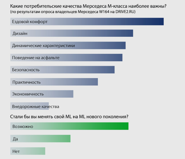 Как бы там ни было, отныне все Мерседесы будут оснащаться именно такими органами управления. Главный конструктор Мерседеса M-класса Томас Меркер говорит, что человек, в конце концов, очень быстро адаптируется к таким вещам, как расположение рычажков. Однако эргономика их как была спорной, так и остаётся, и получается, что нового в этой модернизации не так уж и много. И, кажется, это вообще относится к третьему поколению М-класса. Несмотря на то что на конструктивном уровне это действительно новый автомобиль, он воспринимается как продукт глубокого рестайлинга. Так ведь и клиенты лояльны. Уже продано 1,2 млн кроссоверов. Мы провели опрос среди владельцев машин предыдущей генерации W164 в сообществе DRIVE2: большинство тех, кто откликнулся, не исключает возможности смены своей машины на новый ML. Нужно только кое-что подправить по части надёжности. Доработать пневмоподвеску, например...