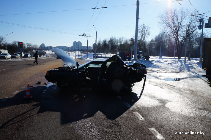 Машина сложилась пополам. Задний мост оторвало и он отвалился. Передние колеса оказались почти под пустыми задними арками. руль пробил крыше над задним сидением и вылез ступицей на улицу. Мотор был под полом(ушел как положено). Передние стойки стекла имели обратный угол! Двери сложились(передние пополам вдоль вертикальной оси, целые задние двери заклинили замками и не открывались. Водитель с оторваными ногами валялся рядом на мосту(не был пристегнут), а его ножки остались зажатыми внутри машины…Пробитый (видимо концом рессоры ) бензобак пролил остатки бензина (благо не много) но было холодно и счастье что пожара не случилось…