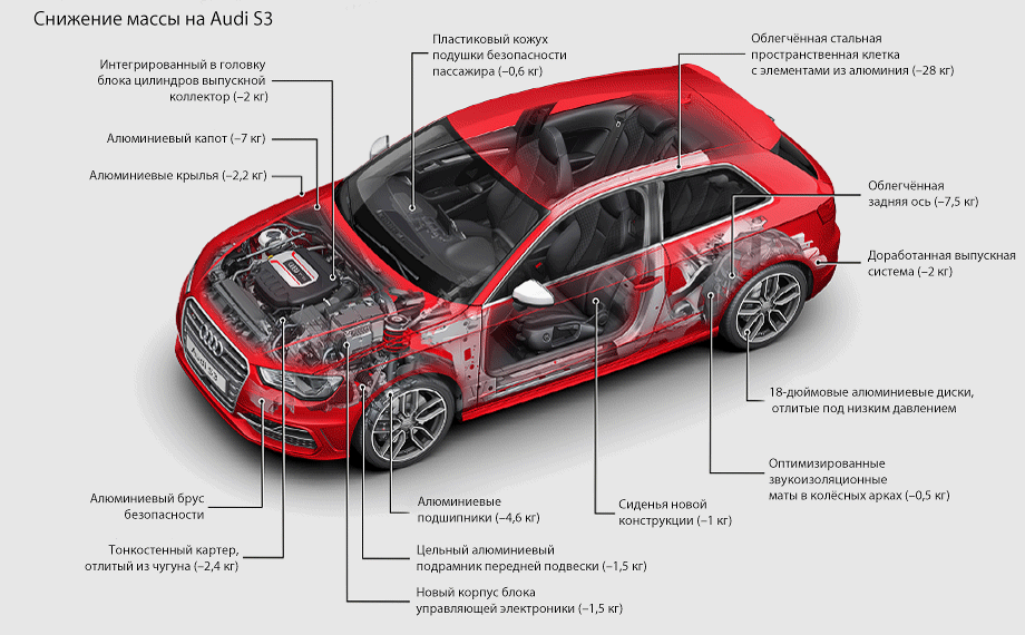 Наддувная «восьмёрка» дополнена восьмиступенчатым «автоматом» ZF, которым оснащаются модели Audi и BMW. У коробки передач есть ещё ручной режим, который становится честным только в режиме Dynamic. Также предлагается Launch Control: утопили две педали в пол, затем резко отпустили тормоз, и на оптимальных оборотах коленвала автомобиль ураганно уносится вперёд. Центральный дифференциал в обычных условиях передаёт на передок 40% тяги, на корму — 60%. В зависимости от условий на переднюю ось может идти до 70% крутящего момента, а на заднюю — до 85%. Система стабилизации обучена имитировать работу блокировки на передней и задней оси, но в качестве опции доступен активный задний редуктор Audi Sport Differential. Блокируя пакет фрикционов на одном из валов, электроника подключает дополнительную повышенную передачу, что заставляет внешнее колесо вращаться быстрее относительно внутреннего и подкручивать машину в поворот. Напоследок обратите внимание, насколько сильно мотор выдаётся за переднюю ось. Это ответ на многие вопросы по управляемости.