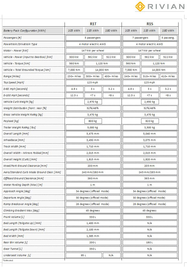 Американская компания Rivian Automotive, вопреки ожиданиям, не стала интриговать концептами. Свои модели она решила представлять в полной боевой готовности. Первым пошёл пикап R1T (вскоре за ним последует кроссовер-близнец R1C). Каждому колесу электромобиля полагается по мотору на 147 кВт (200 л.с.). Суммарная мощность — около 800 сил, а крутящий момент может достигать 14 000 Н•м. Разгон до 96,5 км/ч длится не больше трёх секунд. Запас хода зависит от ёмкости батареи: 105, 135 и 180 кВт•ч обеспечивают 370, 483 и 644 км. Пикап выйдет на рынок США в 2020 году с базовым ценником в $61 500 (4,1 млн рублей). Приём заказов с депозитом в $1000 открыт.