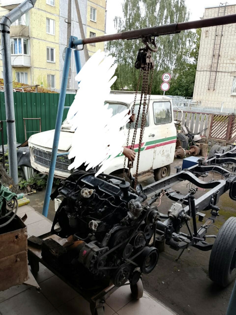 Пришло время установки двигателя на своё место. Двигатель выкатили на телеге, на которой он стоял все эти долгие годы. Для установки, подручными средствами, использовался кран козлового типа и неболь…
