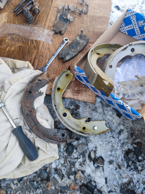 1. Скидываем скобу вместе с колодками сразу открутив 2 болта на 17