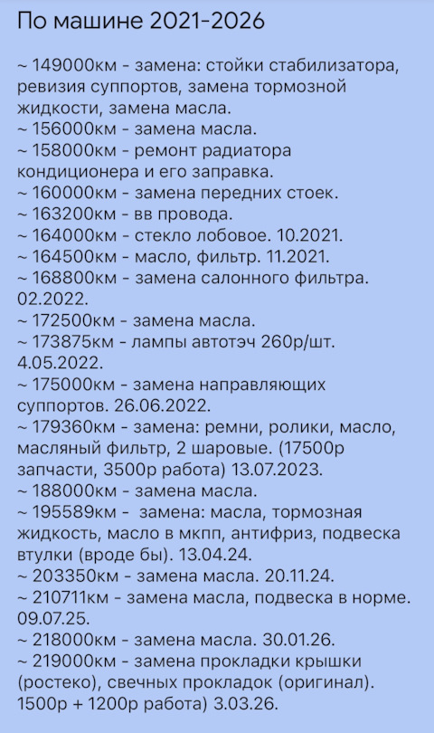 Давно сюда ничего не писал и не выкладывал. То времени нет, то лень. Скажу так: машинка бегает, никаких проблем. Пробег уже 219000км. Слежу так же педантично. Масло каждые 8000км…