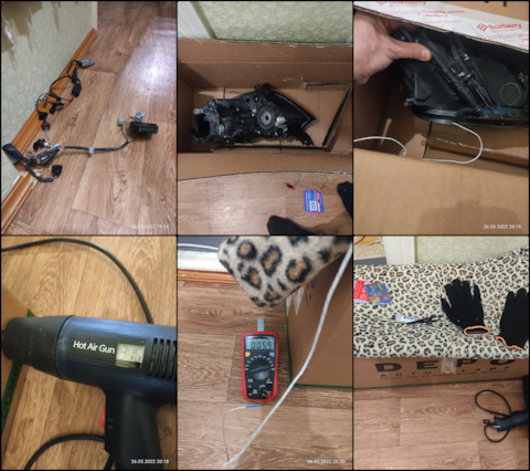 Снял все провода и лампочки. Разбирал через коробку, фен и термопару. Фен 300-350 градусов, при 70 град…