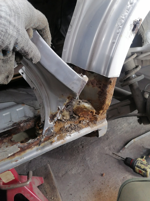 Что бы добраться до внутренней часть пришлось частично вскрыть крыло, ну да ладно все равно его тут тоже пристоит менять. В начале хотел как и справой стороны отремонтировать нижнюю кромку кармана, н…
