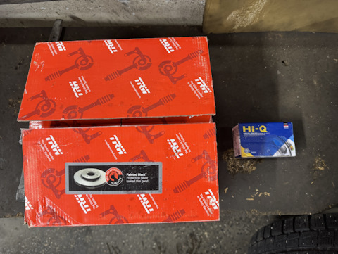 Ну вот и пришли тормозные диски TRW на зад, колодки HI Q. За одним и немного освежили супорта, теперь по кругу всё новенькое и красивенькое.