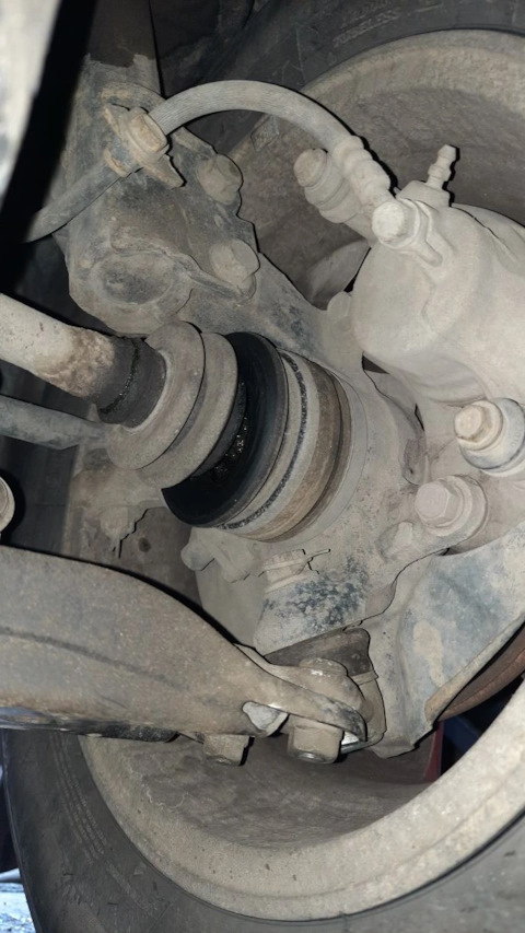 Первым делом заменим левый наружный шрус и заменим оба пыльника. Полез я под машину с тайной надеждой, что пыльник живой и заменить нужно только хрустящую гранат…