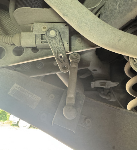При осмотре автомобиля снизу обнаружил неприятную проблему — обломанную тягу датчика положения кузова. Судя по всему, при ремонте подвески датчик не отсоединили, из‑за чего шарик был обломан.