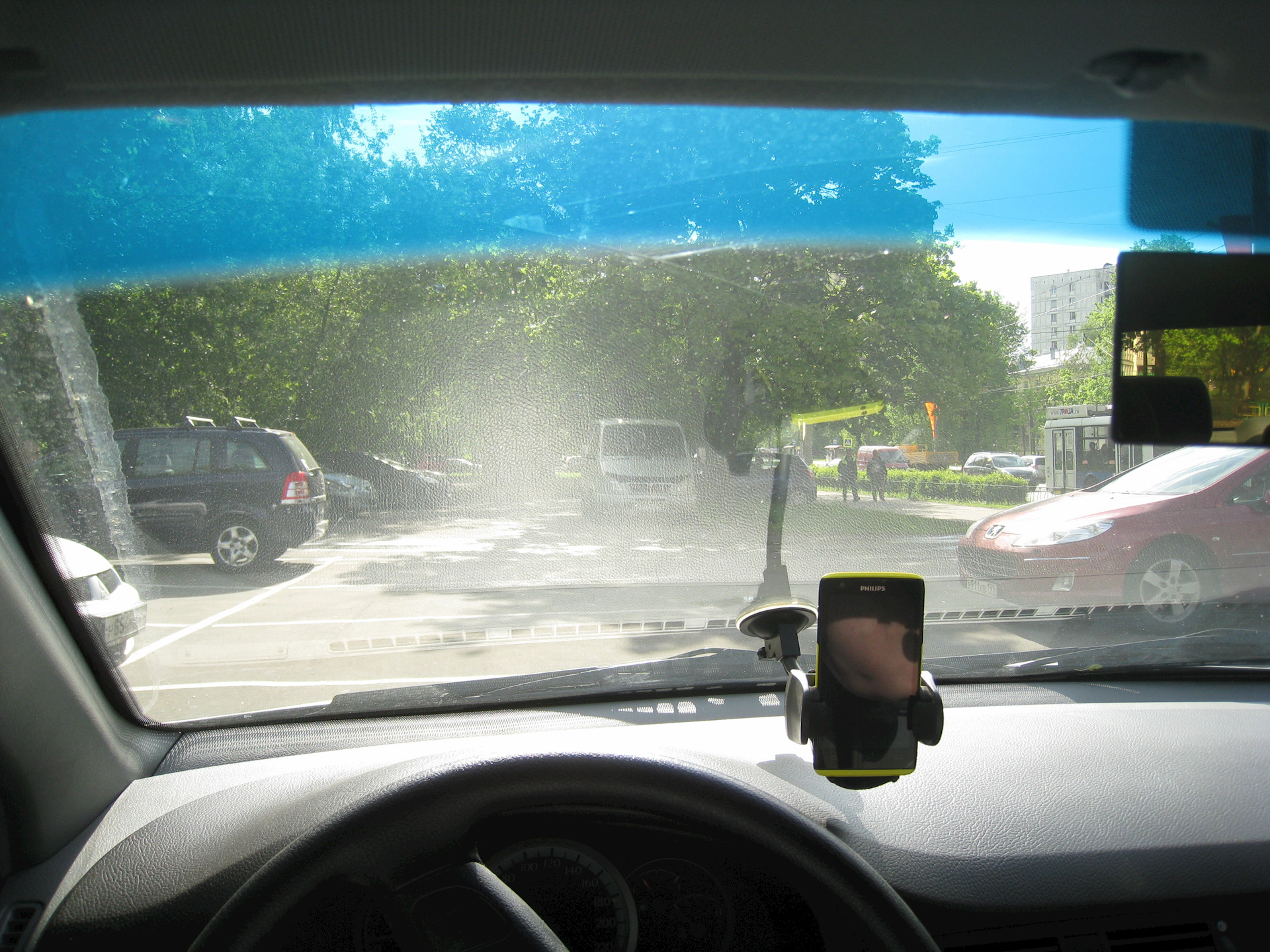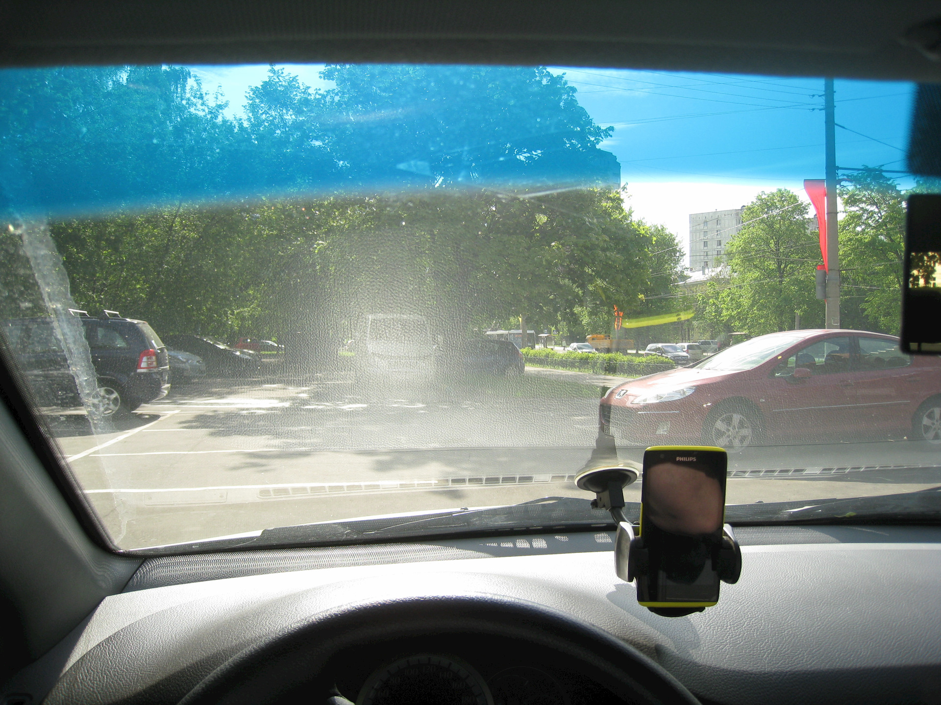 Однако, при определённых условиях, именно у меня, на конкретно моём экземпляре авто — иногда складывалась ситуация, когда вообще хреново видно. И если не понятно о чем речь — вот фото отражения крышки приборки. Пробуем опознать авто за отражением… Даже номера не разобрать, а если пешика не заметить? Фотик ещё пробивает, в реальности бывает ещё хуже. Будто полу прозрачная серебряная плёнка на стекле…