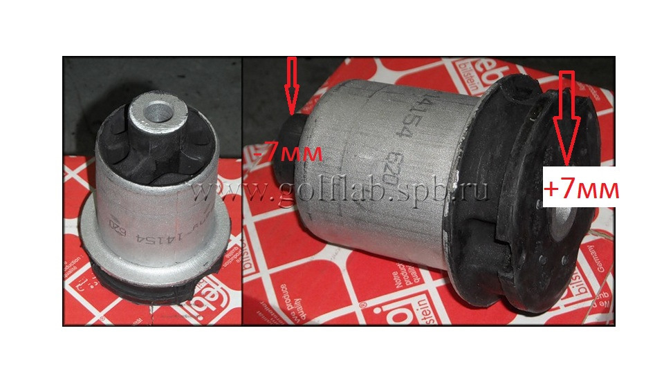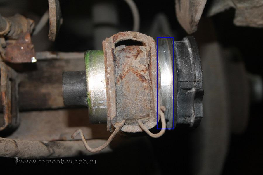 Отрезается выступающая втулочка на 7 мм. А с другой стороны на вставляется проставка такой же толщины. При этом сайлентблок полностью запрессовывается в балку. Это плохо, потому, что все давление приходится на внутреннюю металлическую обойму и отрывает ее от резины.
