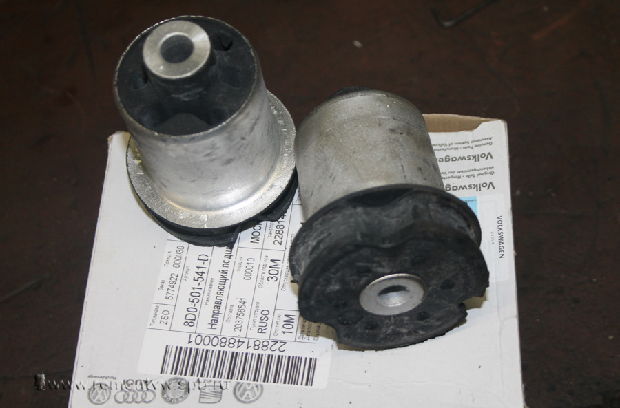 Сказать по правде у самого справа стоят сайлентблоки Lemforder от б3-его. Понравились не очень, потому что при установке на одном начала отходить резинка от металлической втулки, а под ней втулка ржавая. Может они "не очень" оригинальные. А слева поставил от Ауди. Потому что Lemforder, которые хорошо запрессовывались справа, слева практически свободно ходили. Прошёл так порядка 10 000 км. Пока полёт нормальный. Если развалится — буду думать дальше.