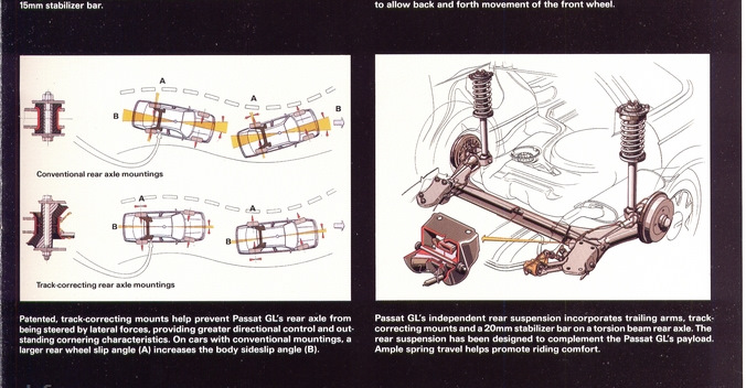 Проходит пассат с родными сайлентами. Вибрации от балки передаются на кузов через резину, центробежная сила пытается вытолкнуть машину. Сила действует вбок. При весе машины в 1400 кг(вес сухой машины + груз, пассажиры и прочее) это довольно неслабая сила. Но сайлентблоки жестко висят в ушах. И каждый сайлентблок, обращенный к внутренней стороне поворота, принимает на себя половину нагрузки от балки. Хотя, судя по иллюстрации все еще более хитро, но упростим до такого. Штатный режим работы. Спасибо Teamer За дополнительную иллюстрацию моих слов. Штатная брошюрка времен молодости б3