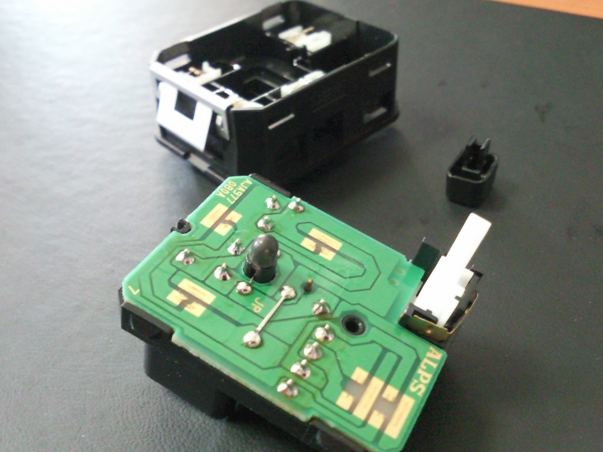 Кнопка регулировки зеркал — вот где полный ахтунг… если бы не товарищ, который помогал мне разобрать эту кнопку, я бы наверное сейчас искал контрактную кнопку ))) Япошки гады по хитрому закрепили кнопку складывания зеркал, и чтобы добраться до платы с лампой, пришлось поковыряться с иголкой ))) Кстати лампа там впаяна, так что будьте готовы взять в руки паяльник ;)