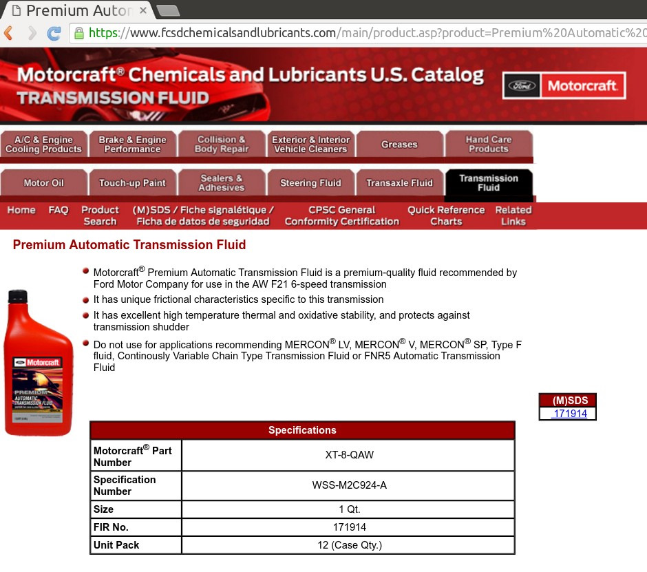 Part number XT-8-QAW (Quarts), Ford Specification WSS-M2C924-A recommended by Ford Motor Company for use in the AW F21 6-speed transmission