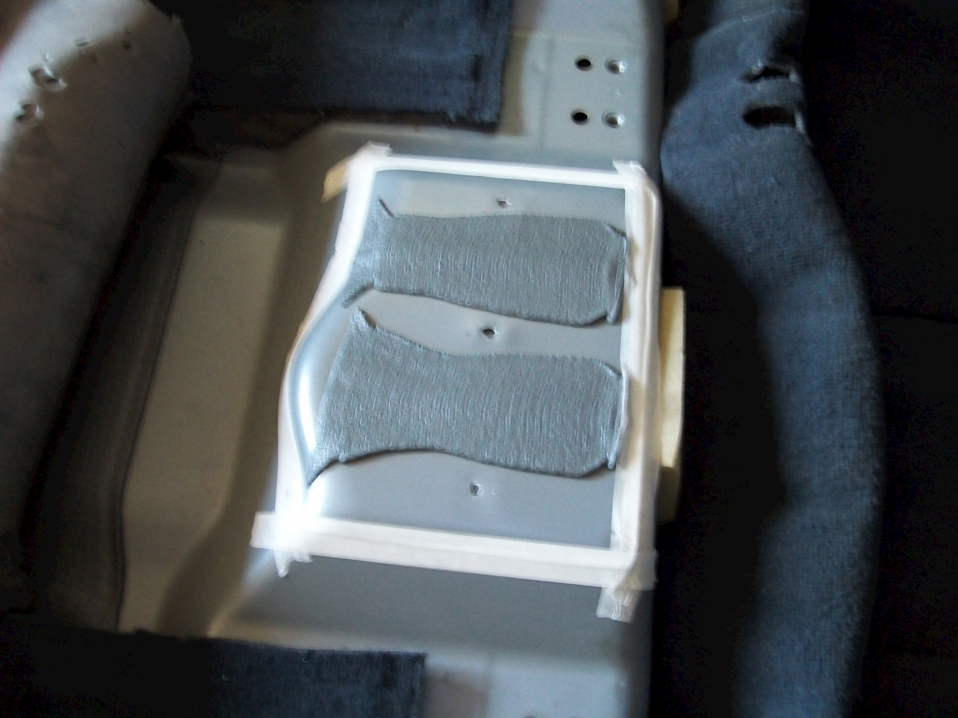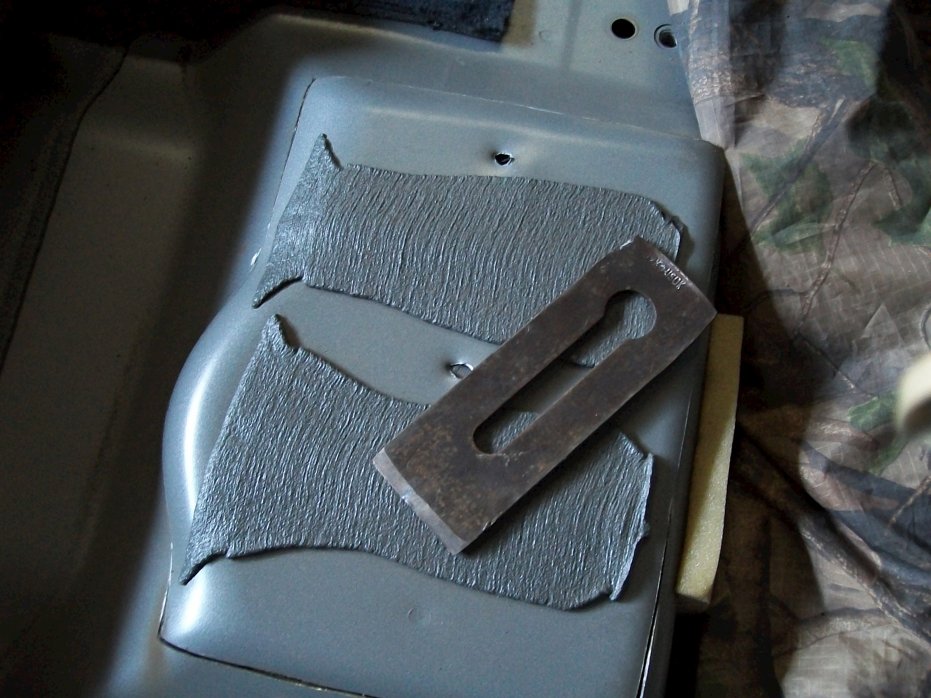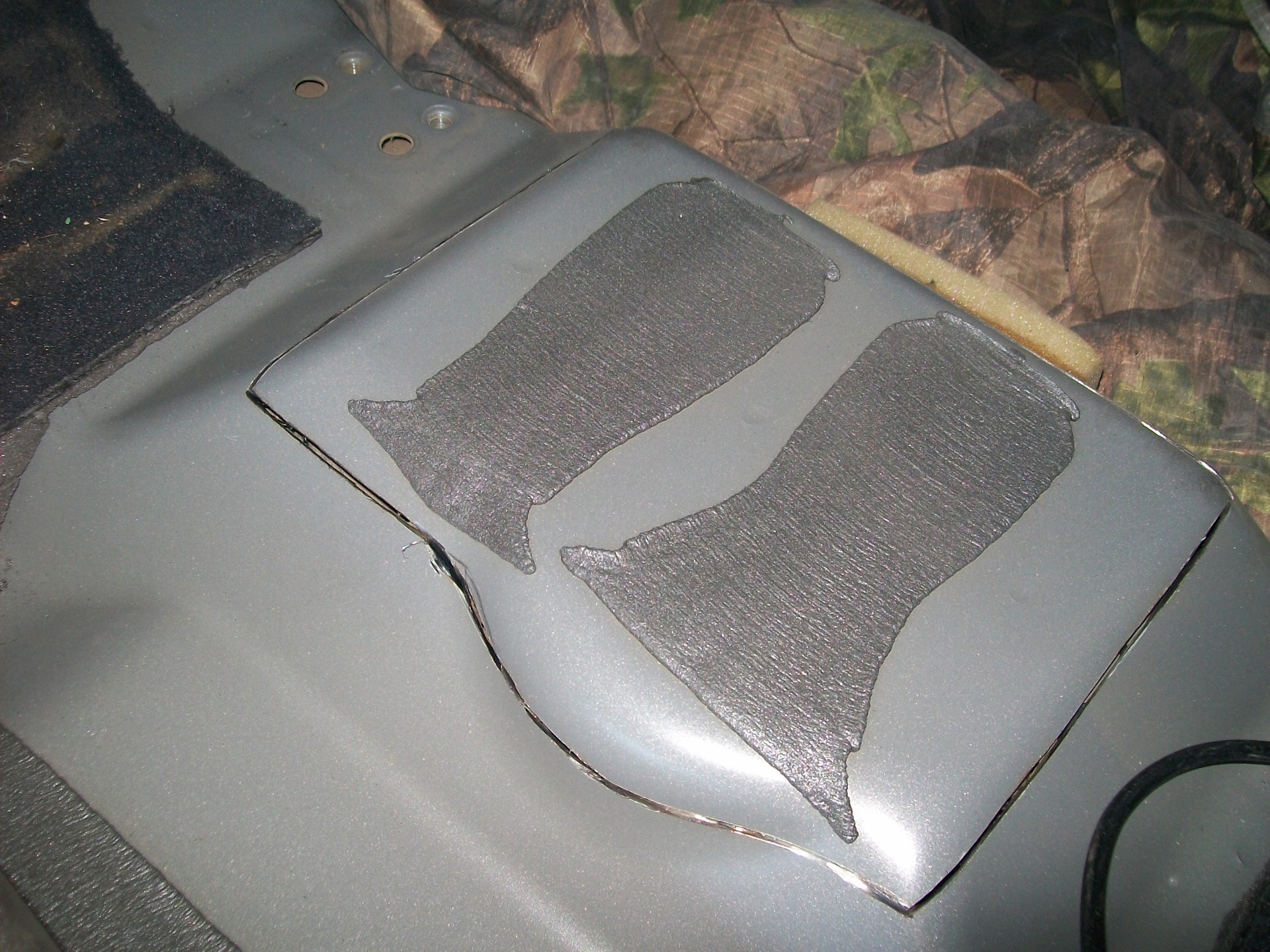 2.-находим под ковриками выпуклость в форме тазика и примерно размечаем положение будущего лючка…