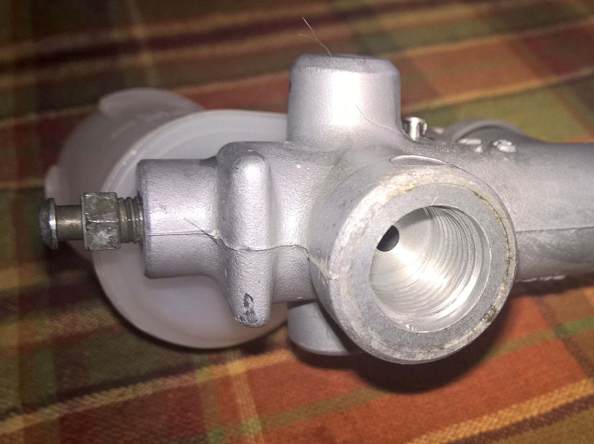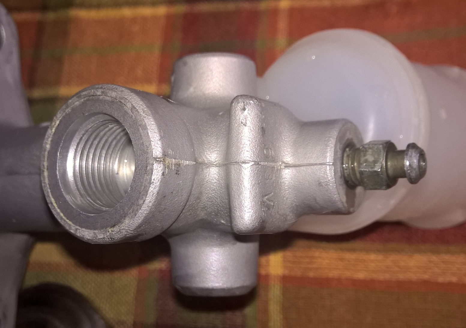 Если честно — назначение грибка мне лично не понятно. Я бы влепил (влеплю если не поможет) на это место обычный болт-заглшушку. Сам грибок внутри полый, у него тонкий канал, а там в грибке — полость. При работе цилиндра в полости грибка создается определенное давление, равное давке на выходе ГСЦ в магистрали гидропривода.