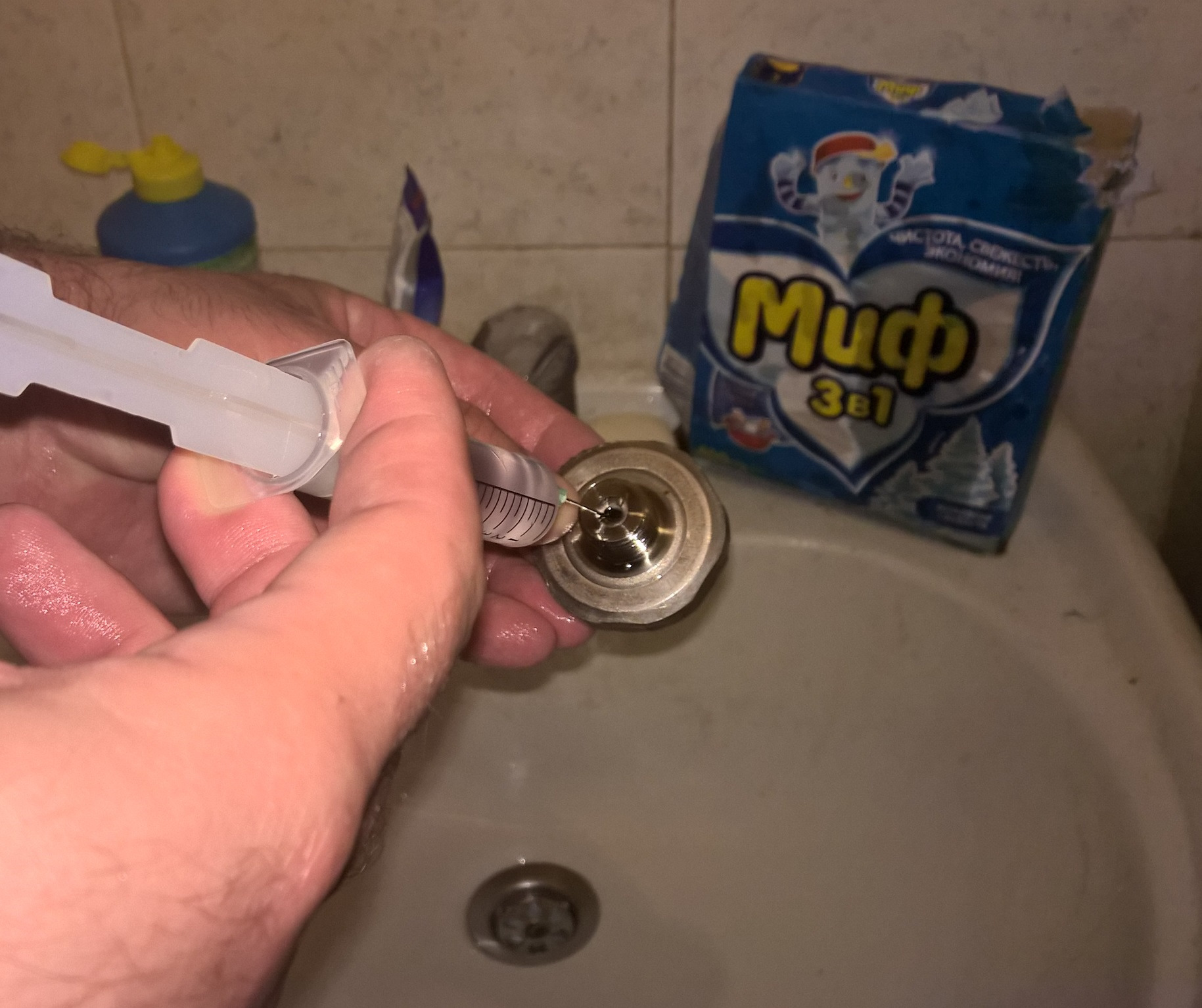 На грибок наложил двойной бандаж из эбоксидной смолы и ХБ ткани. Внутри грибок тоже промыл со шприца. В эбоксидку бухнул двойную порцию катализатора, к утру бандаж привратится в стеклопластик с агдезией к металлу.