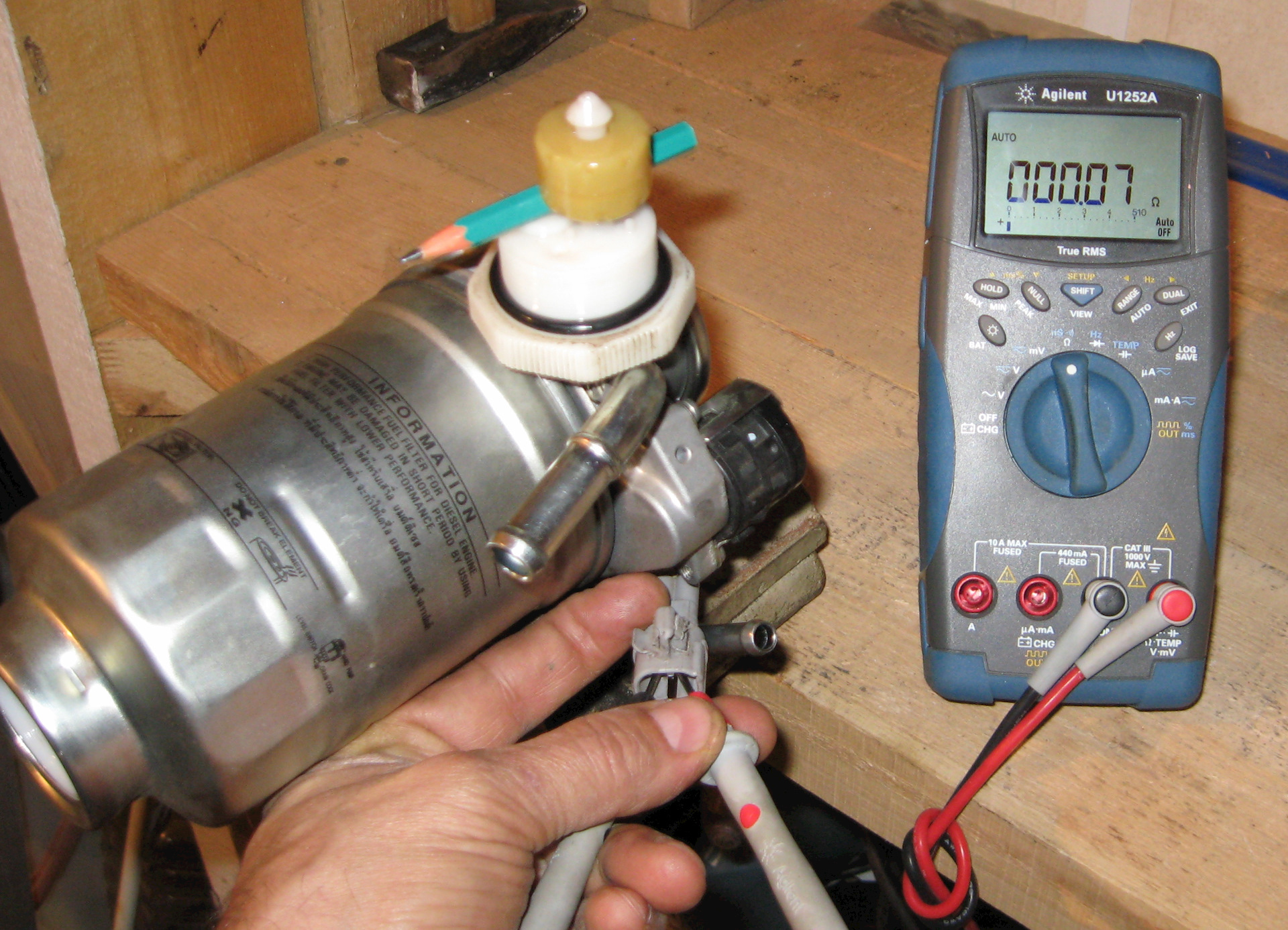 Проверяем подогреватель топлива: измеряем сопротивление между контактами колодки; сколько должно быть не нашел, намерил около 0.5 Ом. Написал и засомневался: больно много в пересчете на мощность получается (примерно 280 Вт), да и проводки там хилые… Проверю — исправлю. Это датчик давления!