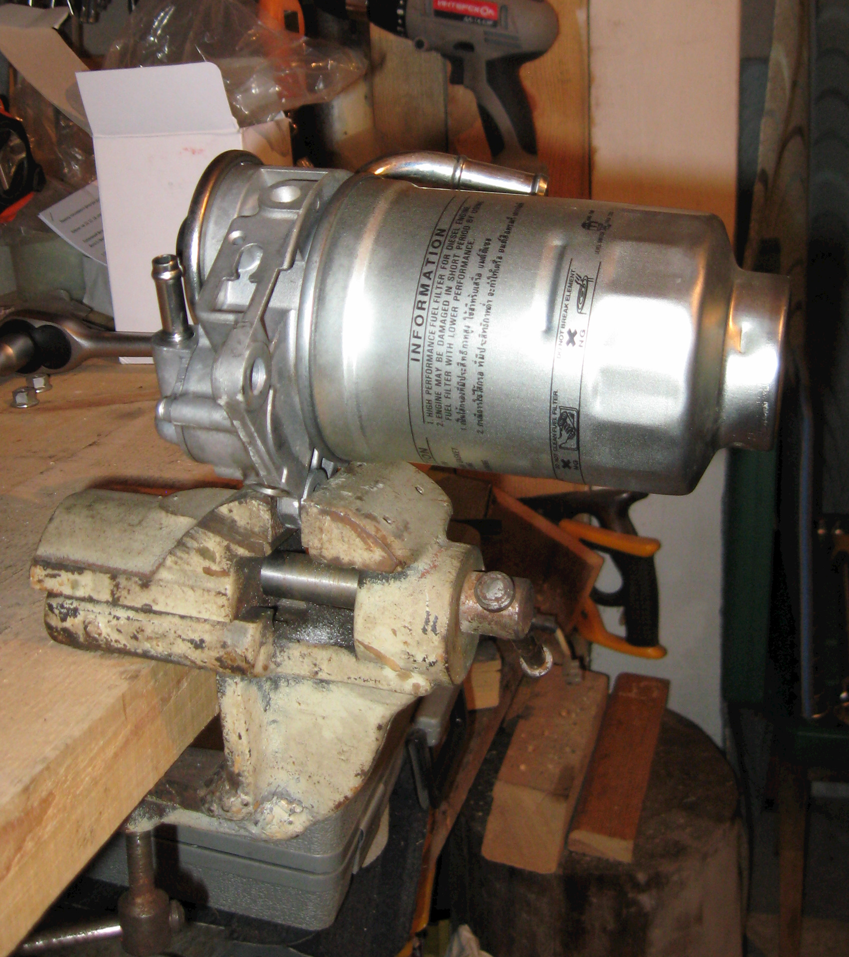 5. Зажимаем в тисках за корпус насоса (а не за фильтр!)